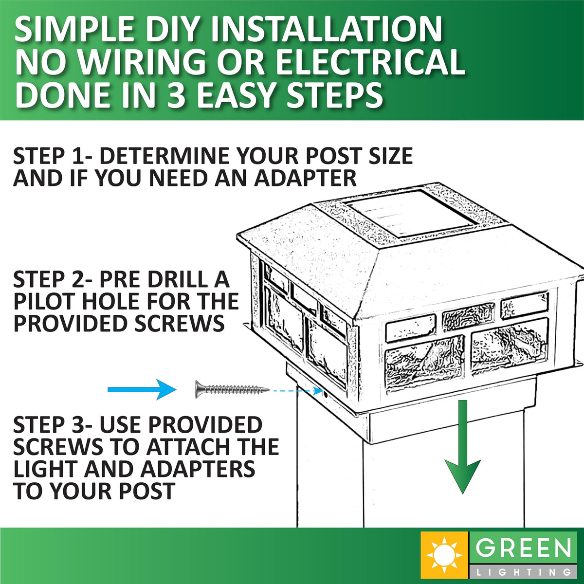Q: Are the GreenLighting Solar Post Cap Lights easy to install?A: Yes, these solar lights are easy to install as they do not require any wiring. Simply mount them at the highest point on your railing for hassle-free setup.