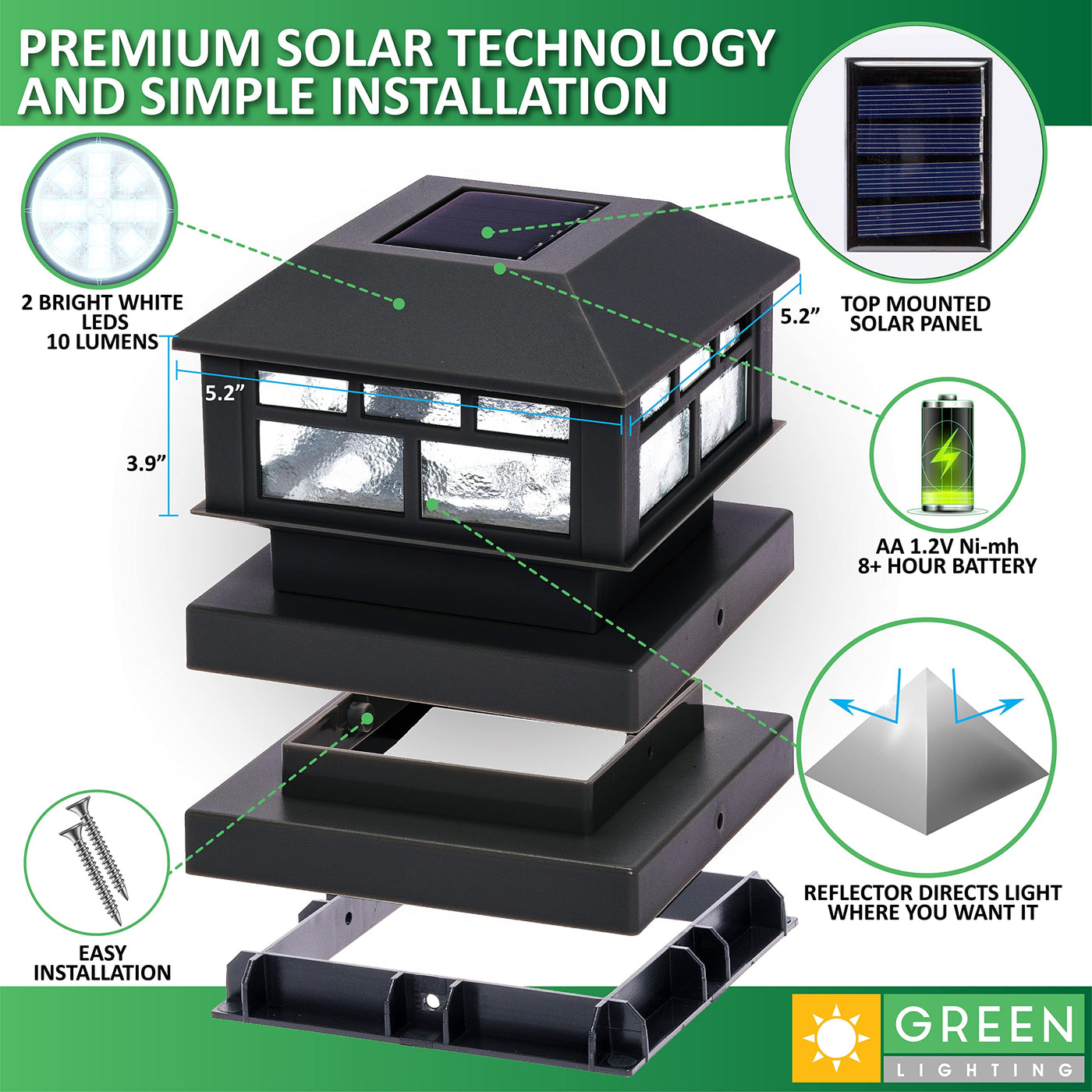 Add A Sleek, Modern Touch To Any Outdoor Living Space With This Modern Design Solar Post Cap Light By Greenlighting. These Solar Cap Lights Can Be Mounted At The Highest Point On The Railing For Added Illumination, Distinction, And Increased Outdoor Enjoyment. Designed To Fit On A 4 X 4 Fence Or Deck Post With An Adapter Set To Fit 5 X 5 Posts, These Solar Caps Features A Smooth Finish And Frame Shape Reminiscent Of California Bungalow Style. Two Bright White Led Light Offers A Gentle Radiance To Your Nighttime Enjoyment, While The Beautifully Textured Lens Adds A Subtle Patterned Glow. Powered By The Sun, These Solar Lights Provides Energy From The Sun During The Day And Will Automatically Turn On At Dusk To Provide Up To 8-Hours Of Light On A Full Battery Charge. 1X Aa 600 Mah Ni-Mh Rechargeable Battery Is Included. Comes As A Set Of 2 Lights; Each Light Measures 5.2'' X 5.2'' X 3.9''