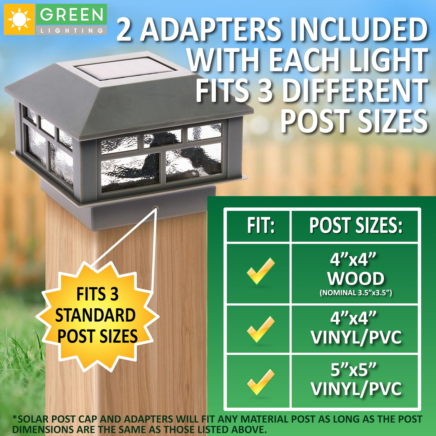 Q: What sizes of posts do the GreenLighting Solar Post Cap Lights fit?A: The GreenLighting Solar Post Cap Lights are designed to fit 4x4 wood posts and can be adapted to fit 5x5 PVC or vinyl posts using the included adapter set.