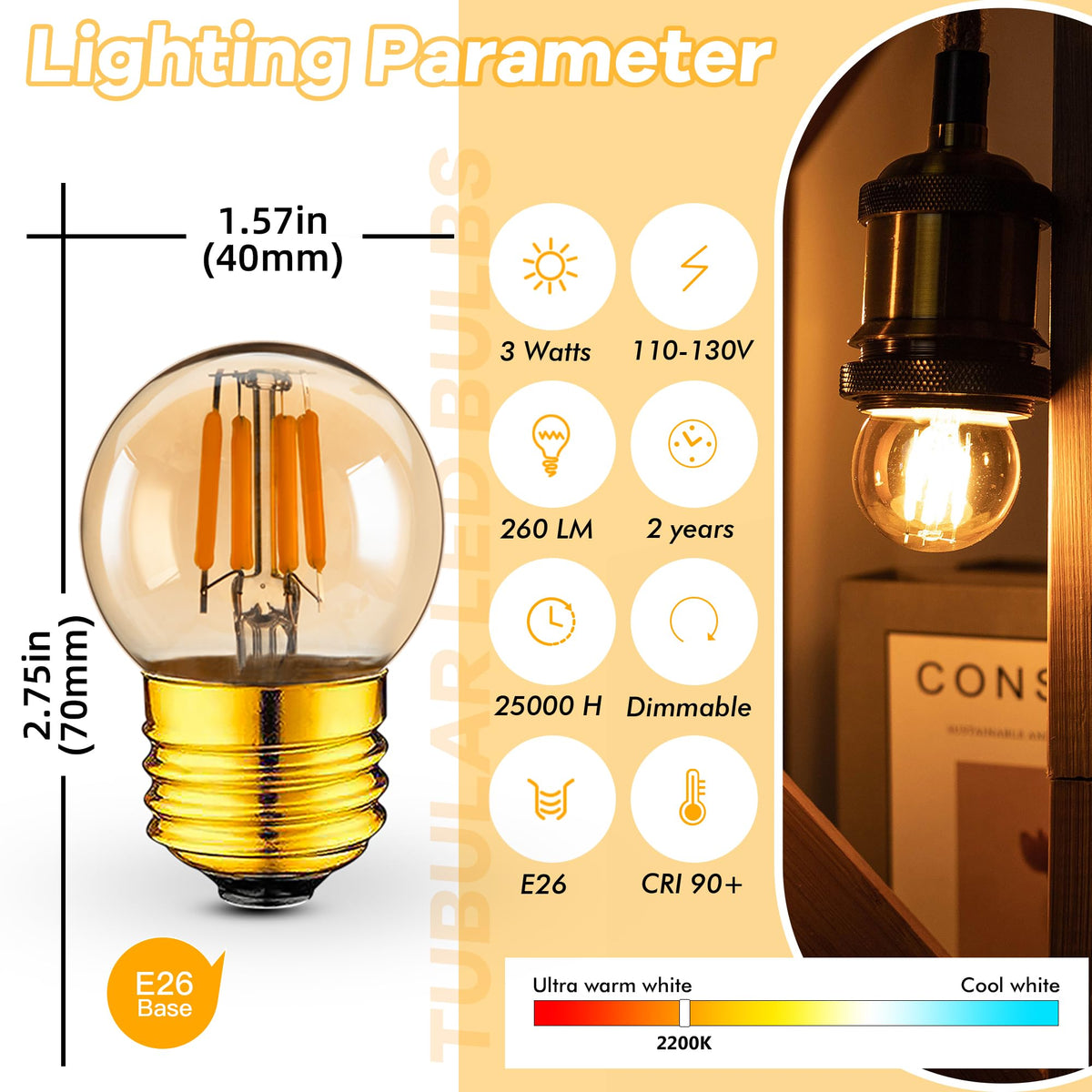Grensk 3 Watt Dimmable Low Wattage LED Bulbs Equivalent to 25 Watt Light Bulbs,E26 Standard Base G40 Small Globe Light Bulbs,2200K Warm Light for Bedroom Study Lighting,Amber Glass,110V,2PCS