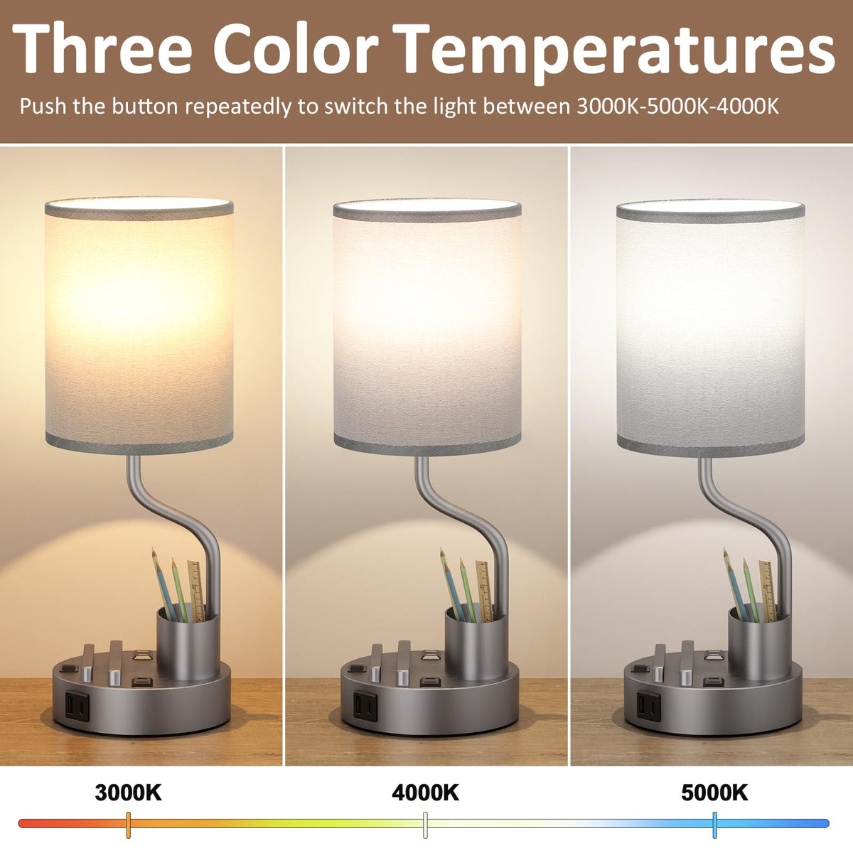 Grey Bedside Table Lamps For Bedroom Set Of 2 - Nightstand Light With Ac Outlet And Usb A & C For Charging, 3 Color Temperatures