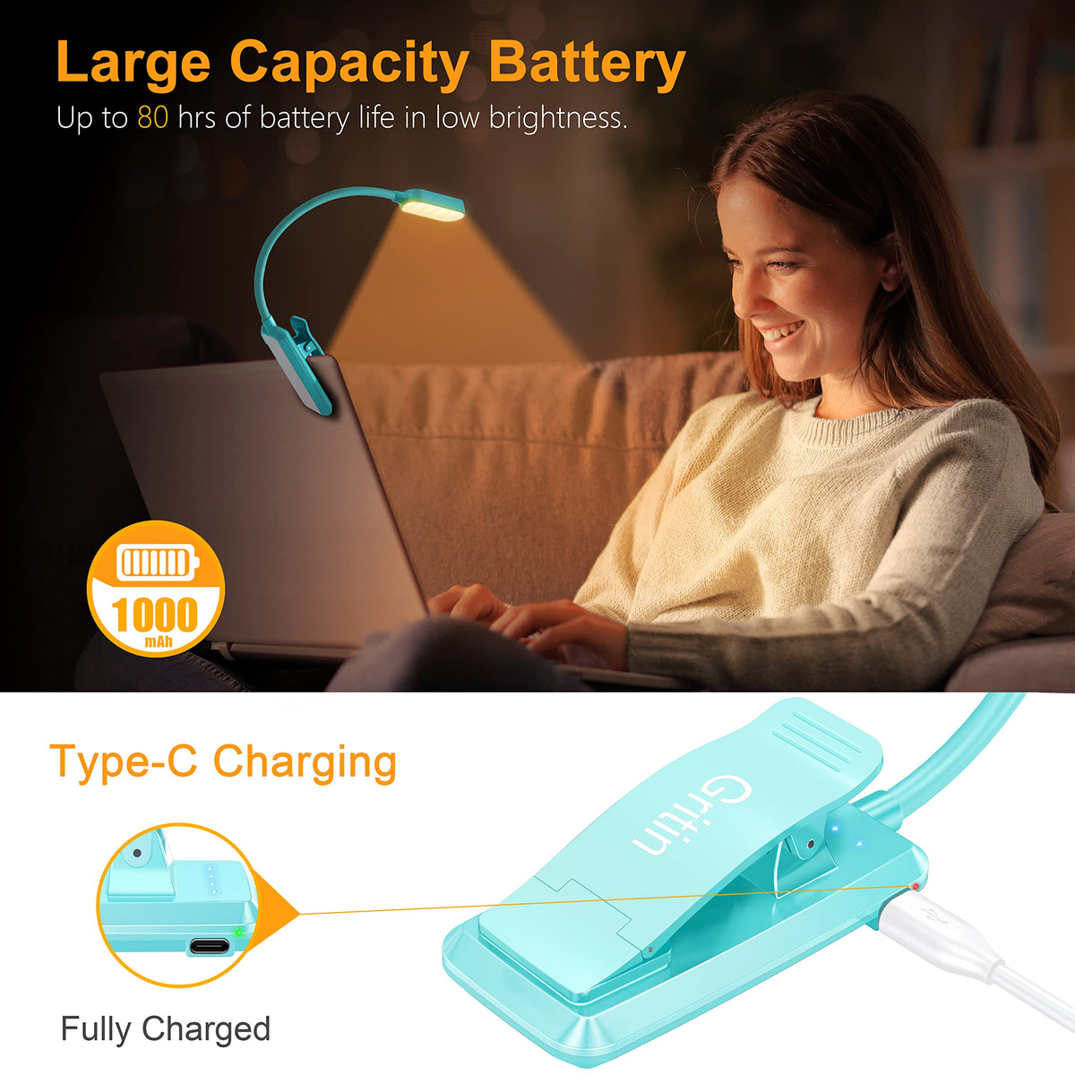 Q: How long does the battery last on the Gritin Book Light?A: The built-in 1000 mAh battery provides up to 6 hours of continuous use at high brightness and can last up to 80 hours at the lowest brightness setting. It only takes about two hours to fully recharge.