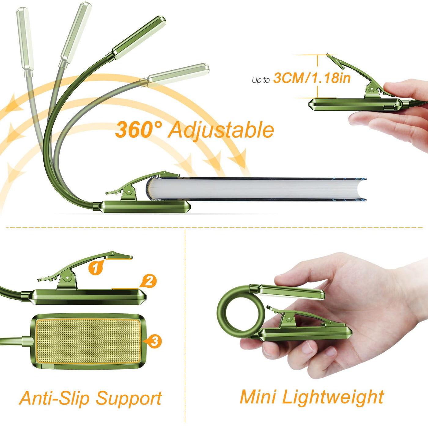 Stepless Dimming and 3 Color Modes: Adjust the brightness from 100% to 10% by long press button to suit different reading environment. Simple switch 3 color temperature lighting modes by clicking the button: mixed color, cool white, warm | Eye Protecting Reading Light: No flicker, no shadow, no dizzy light. Provide a natural and soft light which won? strain your eyes even after long hours of use. Enjoy your reading time without disturbing your partner or roommate | 1000 mAh Rechargeable Battery: Built-in 1000 mAh battery only takes about 2.5 hours to get a full charge and support up to 80 hours lighting at lowest brightness. 4 LED indicator lights will always show the remaining power of the light | 360? Flexible Neck & Sturdy Clip: 360? bendable goose neck can be rotated to any angle you want. Anti-skid clip design makes it firmly clamp on an e-reader, books, shelf, etc | Portable and Widely Use: Lightweight and sturdy book light can stand independently with the anti-slip pad on the bottom. Free your hands to enjoy bedtime reading, working, traveling, camping etc