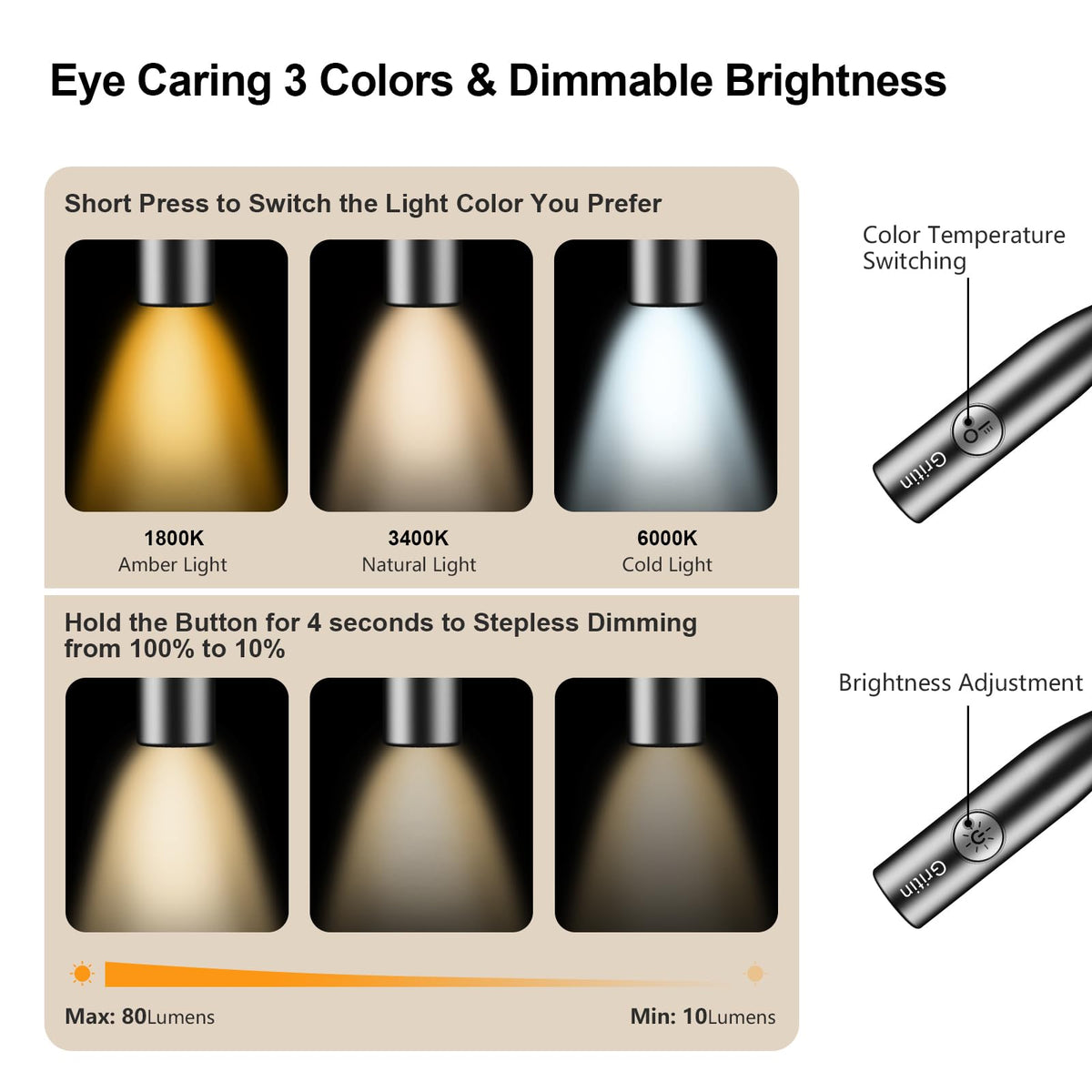 3 Colors and Stepless Dimming: Tailor your lighting to your needs with three adjustable color temperatures. Switch between Amber (1800K), Warm White (3400K), and White (6000K) with a short press of the color temperature button. Achieve the perfect brightness for any situation by simply long-pressing the switch button for stepless dimming capabilities.
