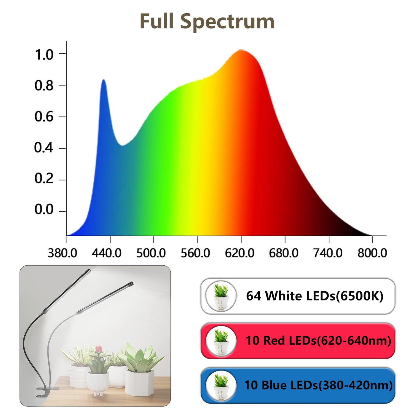 The full-spectrum LED grow light operates with a combination of red, blue, and white lights to best support photosynthesis and enhance growth. Its 360° adjustable gooseneck allows you to direct light precisely where your plants need it most, ensuring they receive adequate illumination from every angle.