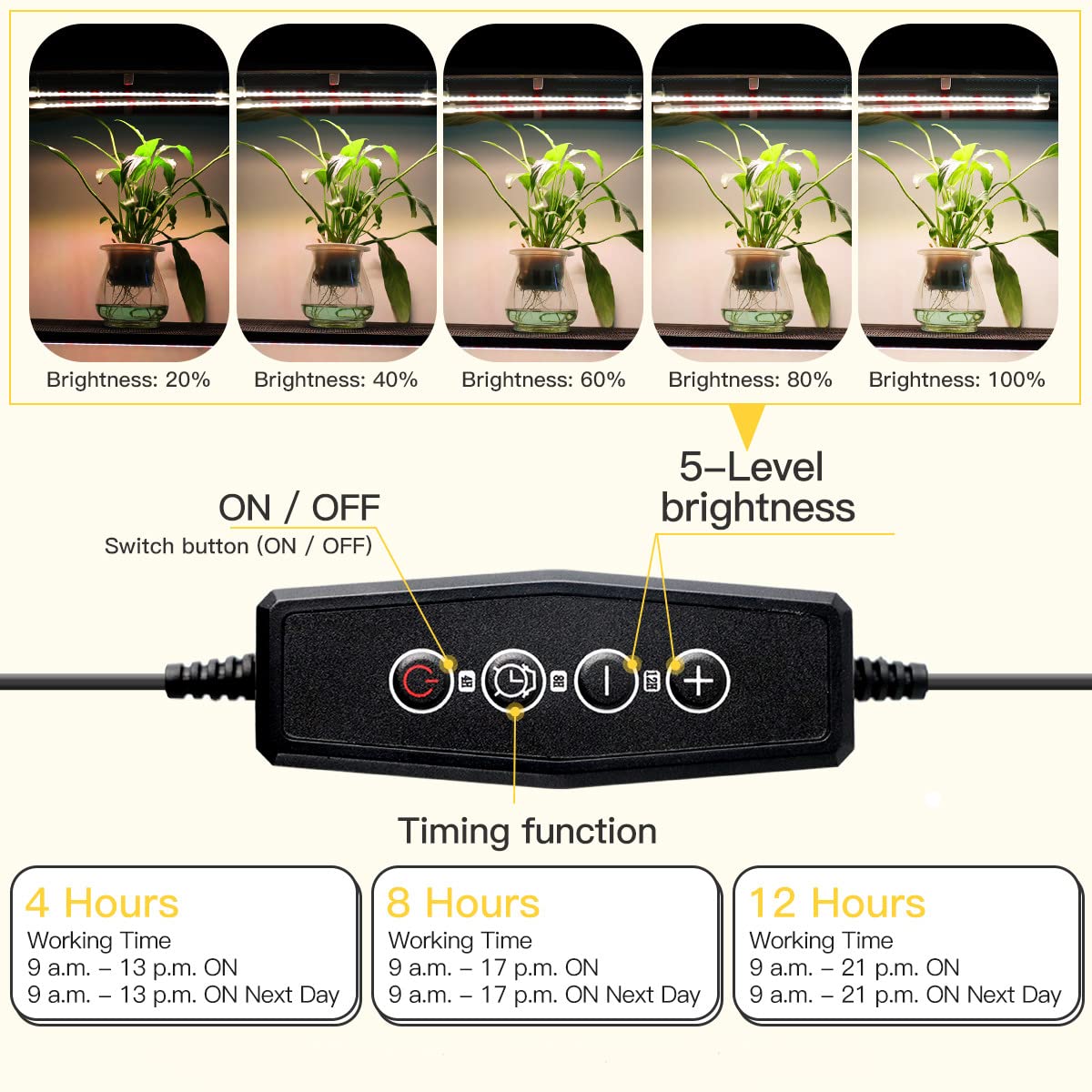 Q: What are the timer and dimming features of this plant light?A: The indoor seedling light includes a built-in timer with options for 4, 8, or 12 hours, along with a 5-level dimmable feature. This allows for automatic on/off functionality, making it convenient for daily use.