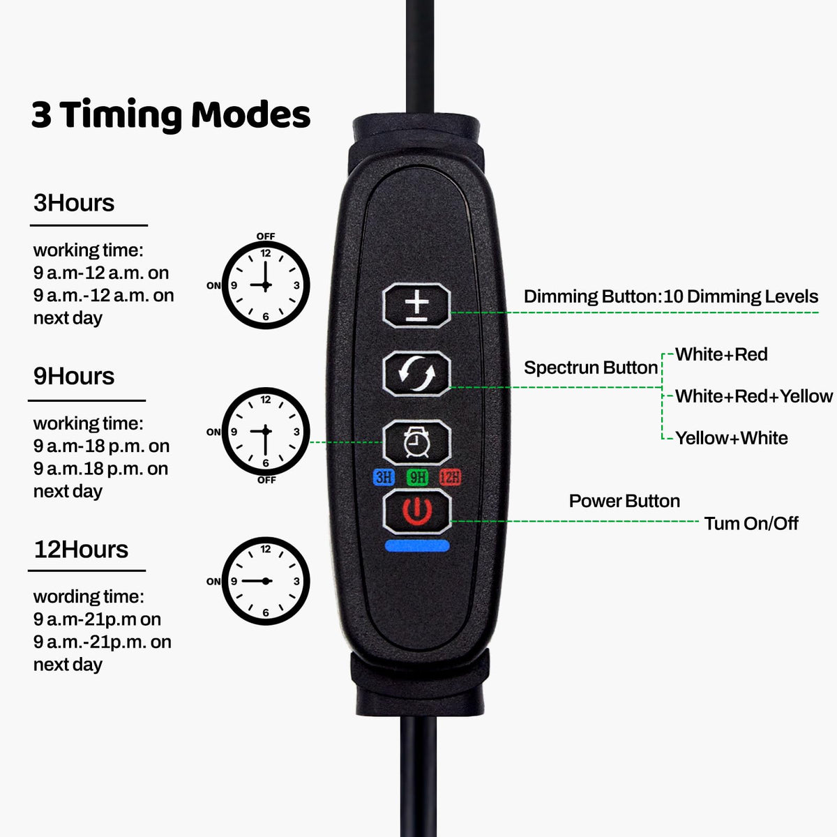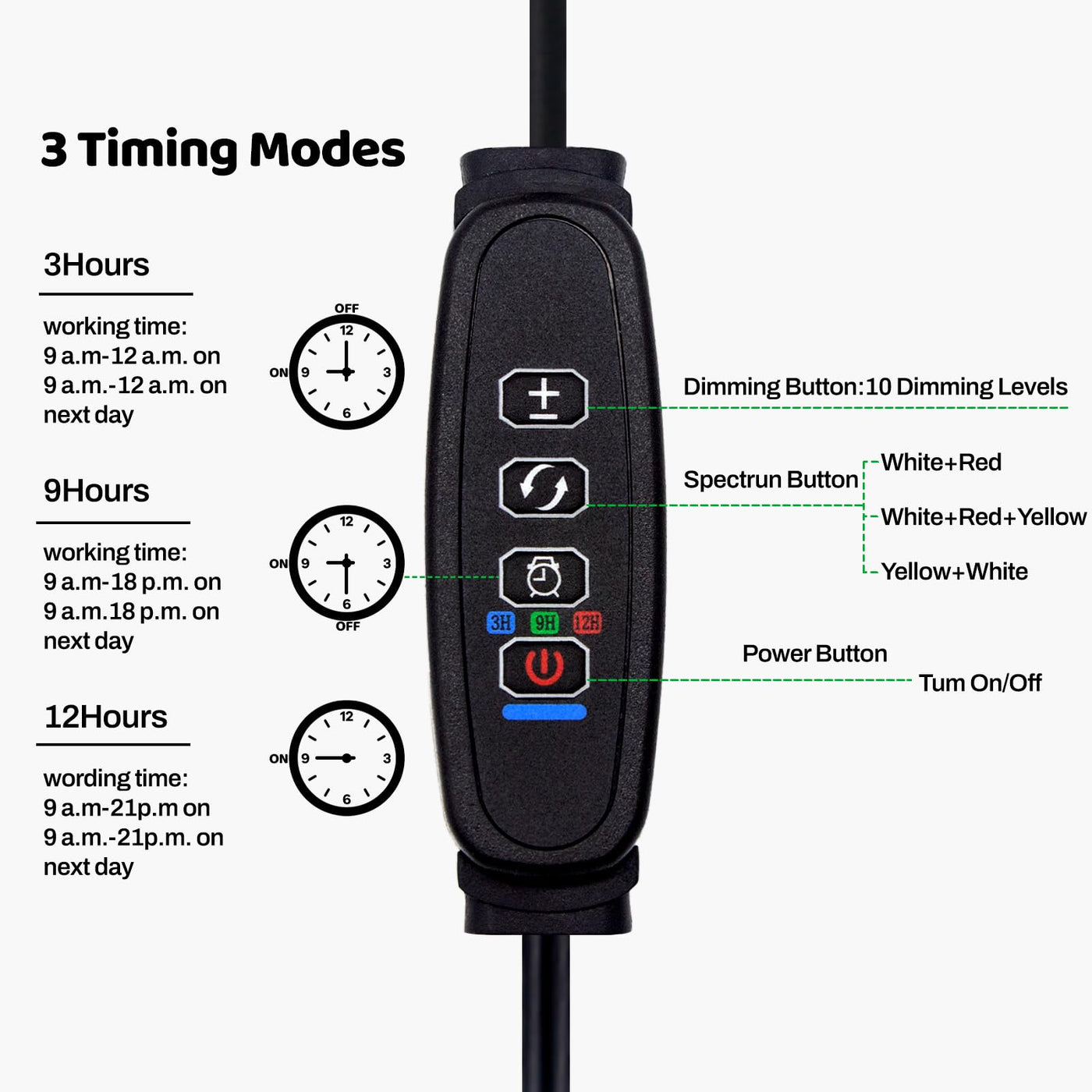 Upgraded Auto ON/OFF Timer: Automatically turns on/off according to settings: 3H (Blue), 9H (Green), and 12H (Red).
