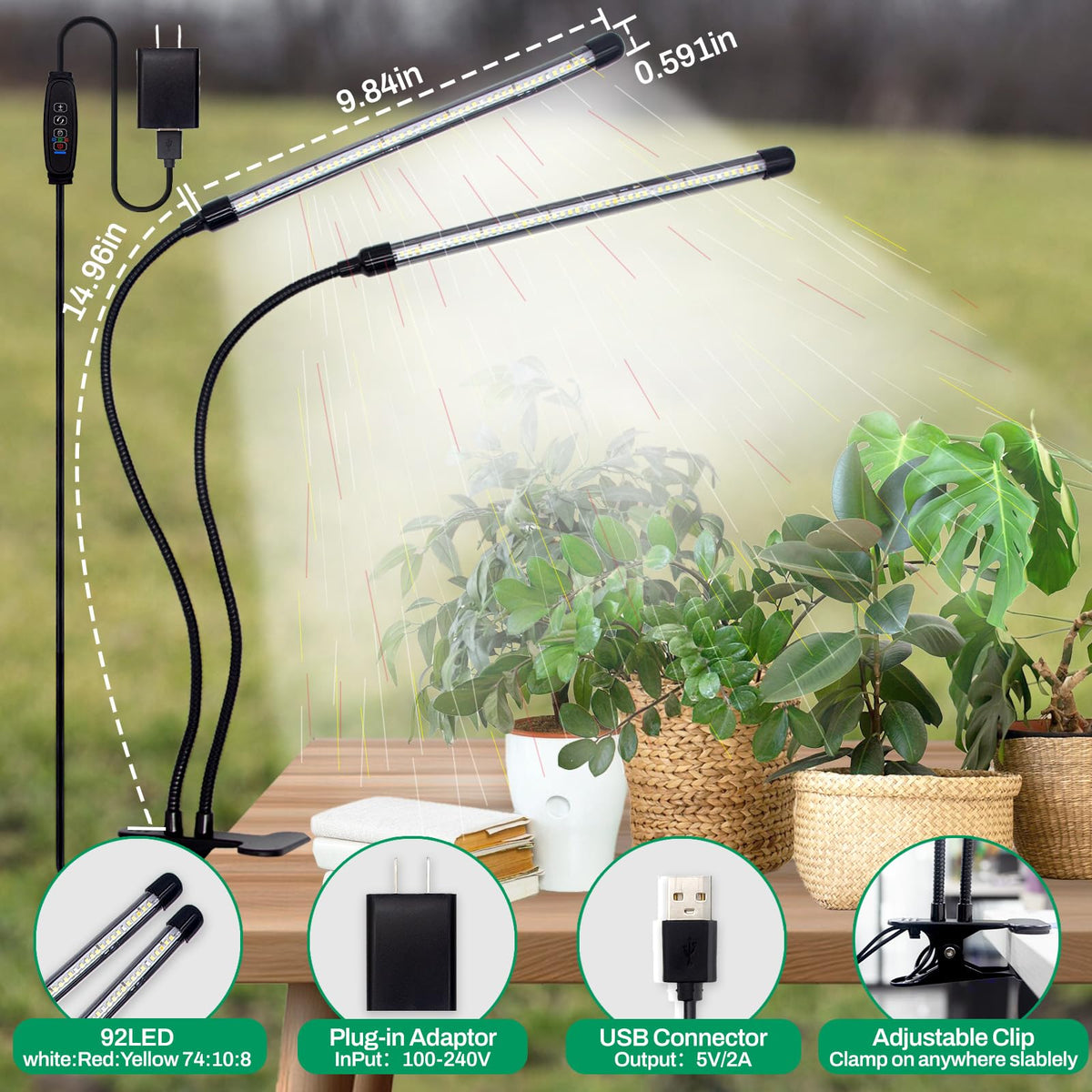 LEOTER Grow Lights for Indoor Plants - 96 LED Full Spectrum, 5-Level Dimmable, Auto On/Off, 2 Heads, Black, Model: light-002