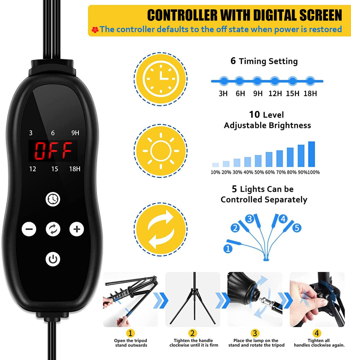 The Features of the grow light ???Wire Organizer?: The design of wire Organizer is very unique,which avoids tangle of multiple wires, It looks beautiful and easy to assemble. ???Controller with Digital Screen?: Different from the ordinary controller on the market, it is upgraded to 6 timing modes 3H/6H/9H/12/15/18H, and has a digital display screen, which looks classy and easy to operate. ???High Color Rendering Index?: It adopts high display finger led with color rendering index 95Ra, which is conducive to protecting our eyes. It can be used as a desk lamp. You can enjoy it to read and write.