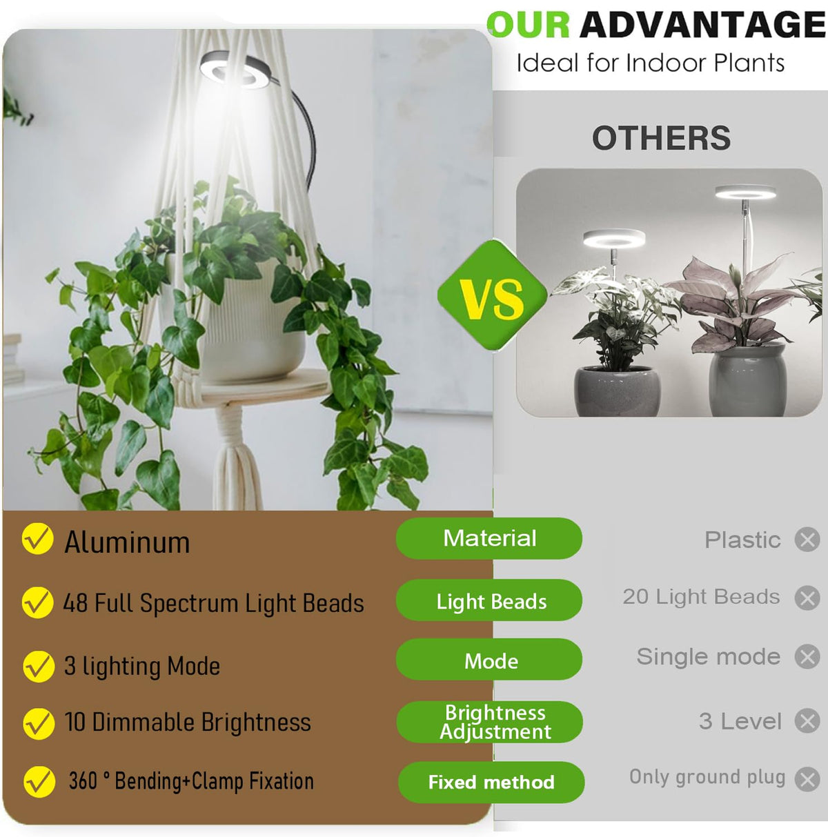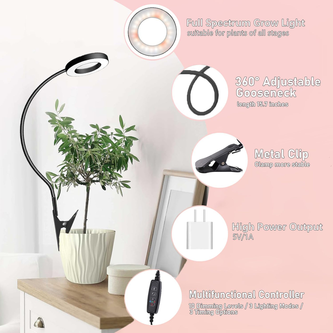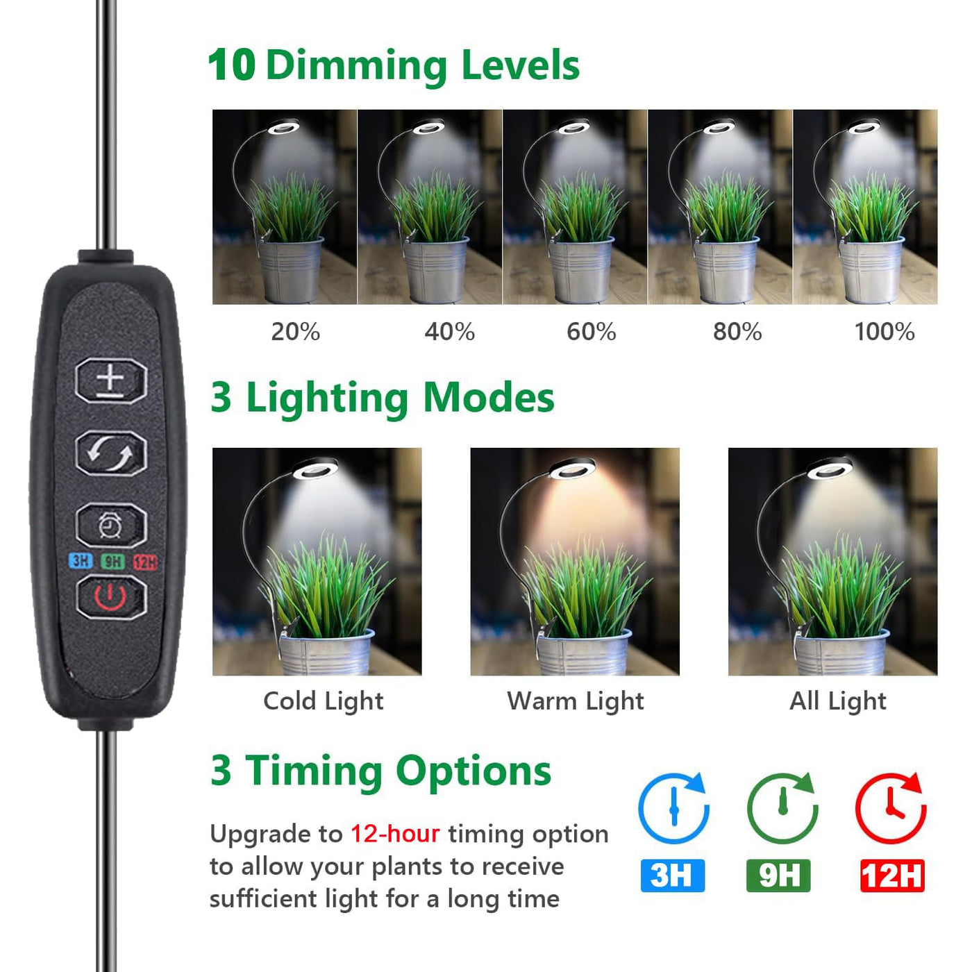Elevate your indoor gardening with the LED Grow Light. This full-spectrum light comes equipped with 10 dimmable levels, allowing you to customize the brightness from 10% to 100% for your plants' unique requirements. The 3/9/12-hour automatic timer ensures a consistent lighting schedule, ideal for busy plant enthusiasts. The stable clip securely attaches to the edge of plant pots, while the 360° rotating gooseneck offers flexibility in positioning. Easy to install and compact in design, this grow light is a practical and efficient solution for your indoor plants. Perfect for grow lights for indoor plants full spectrum, plant lights for indoor growing, led grow lights for indoor plants, and more. Additionally, the Pot Clip LED Plant Light for Growing Full Spectrum ensures even more precise lighting for your beloved plants. Illuminate your plants' growth journey!