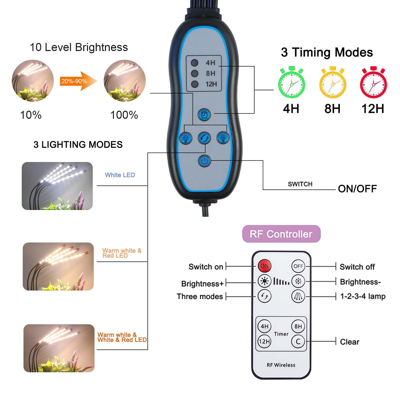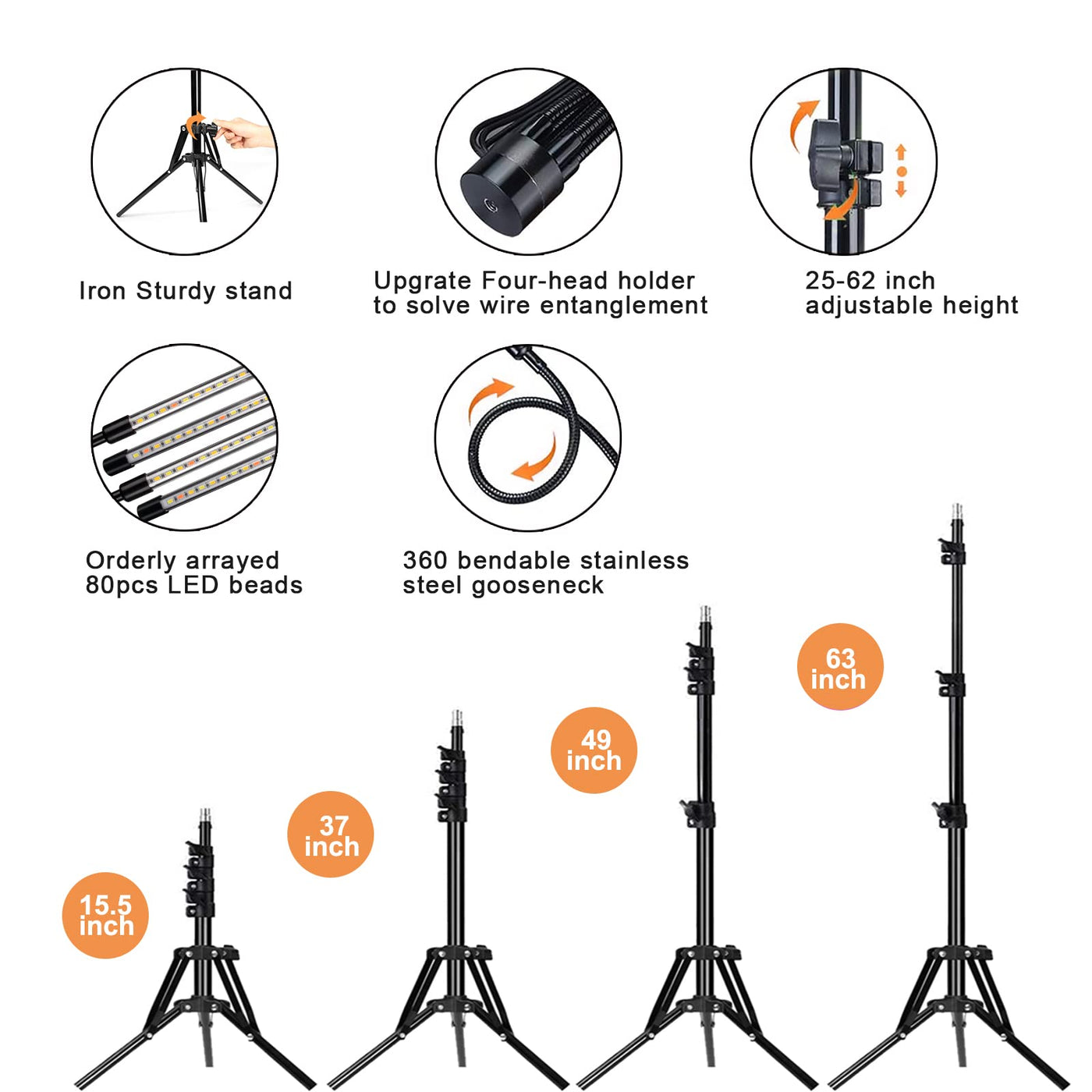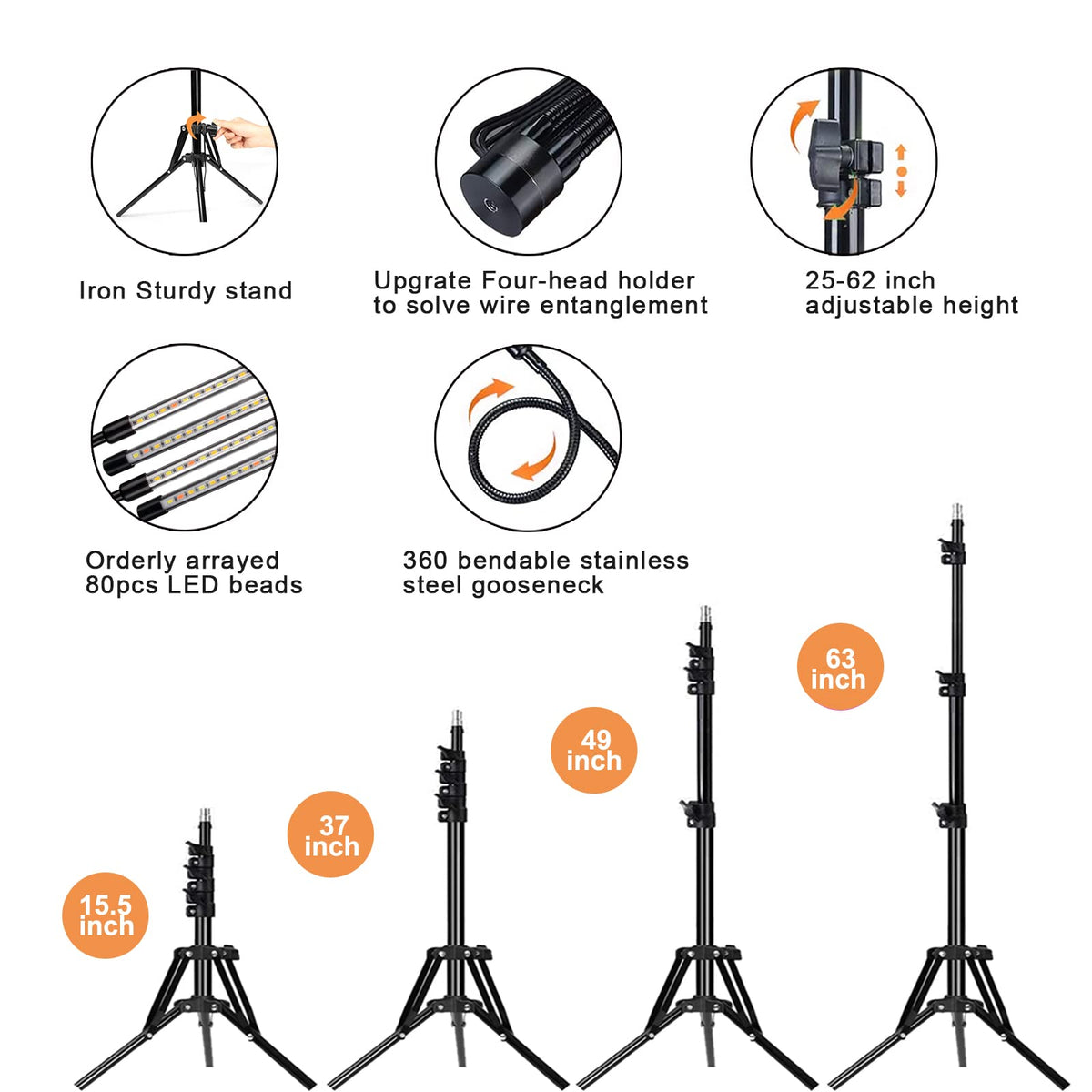 Growstar Plant Grow Light With Stand, 4 Heads Full Spectrum Grow Lamps With 15-63" Adjustable Tripod Stand, 4/8/12H Timer, 3 Switch Modes, Indoor Plant Light With Remote Control