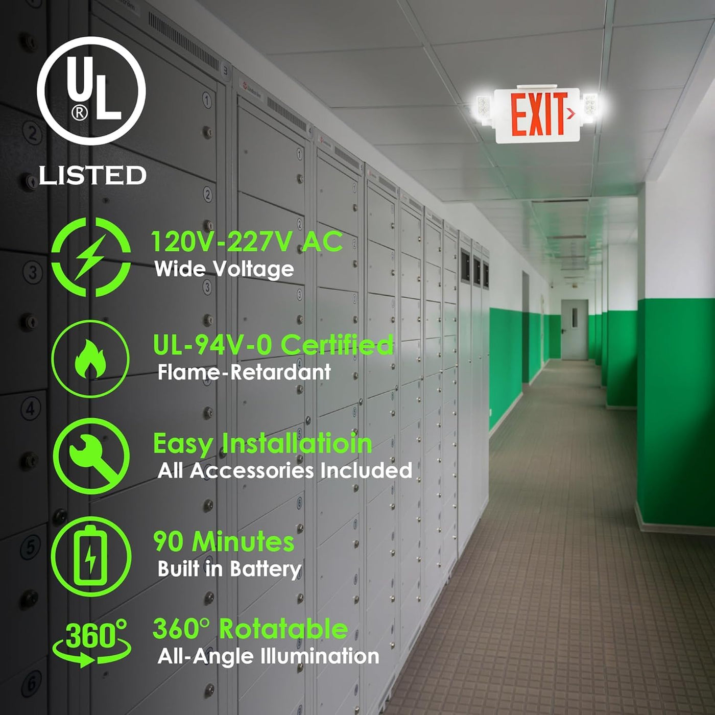 Gruenlich Led Combo Exit Sign, Emergency Light With 2 Adjustable Heads And Double Face, Back Up Batteries- Us Standard Red Lette
