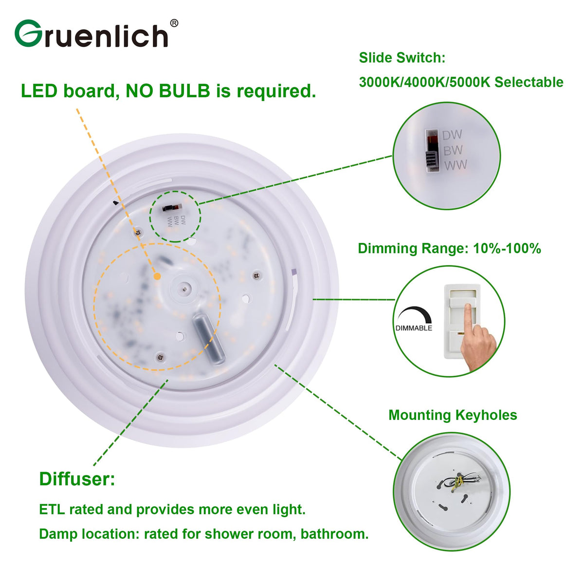 Q: Is the Gruenlich LED Flush Mount dimmable?A: Yes, this ceiling light is dimmable, allowing you to adjust the brightness according to your preference.