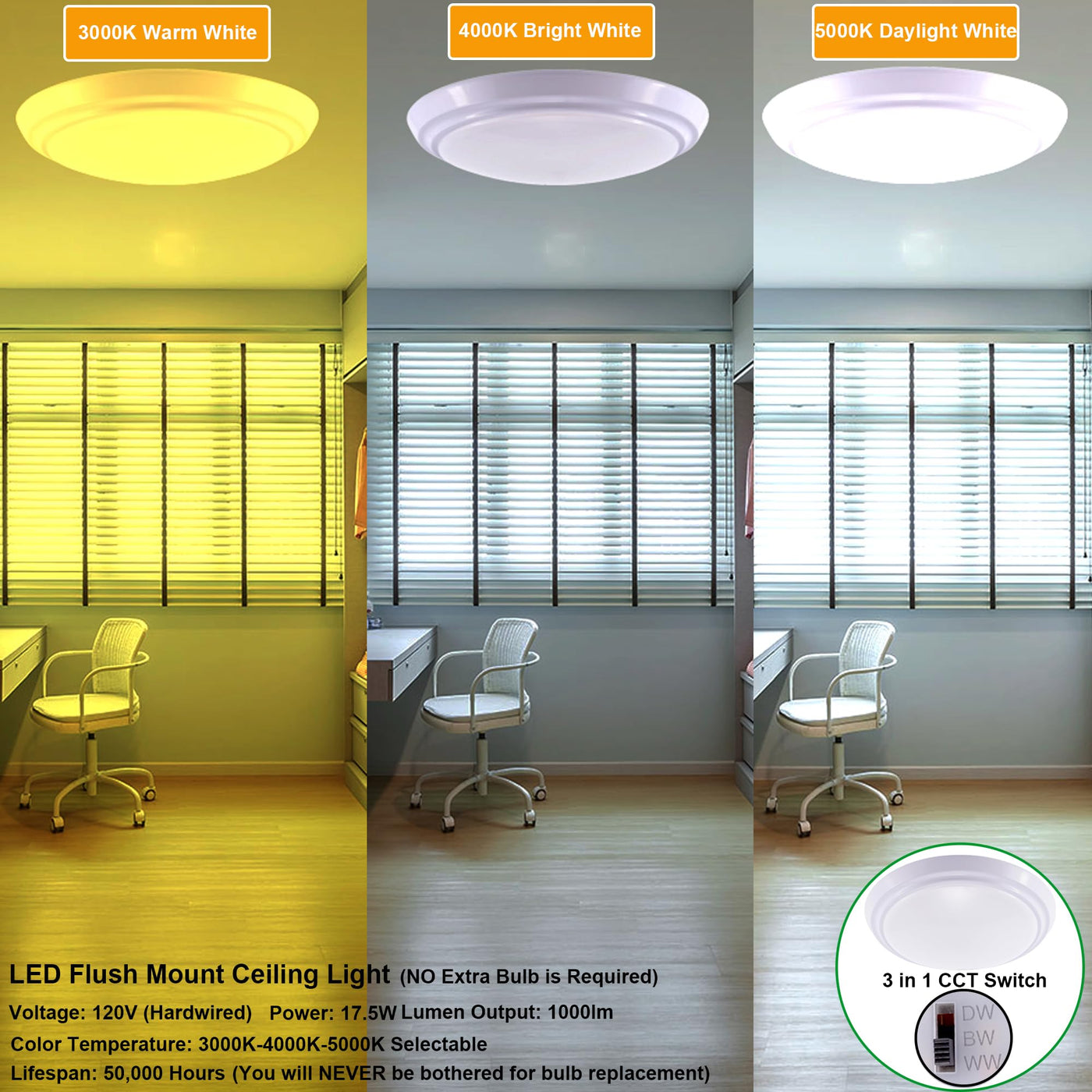 This ceiling light features well-made aluminum housing that ensures durability and longevity. It is specifically designed to be damp location rated, making it suitable for areas such as bathrooms, kitchens, and covered outdoor spaces. The light offers a bright output of 1000 lumens while consuming only 17.5 watts of energy, which makes it an energy-efficient alternative to traditional lighting solutions.