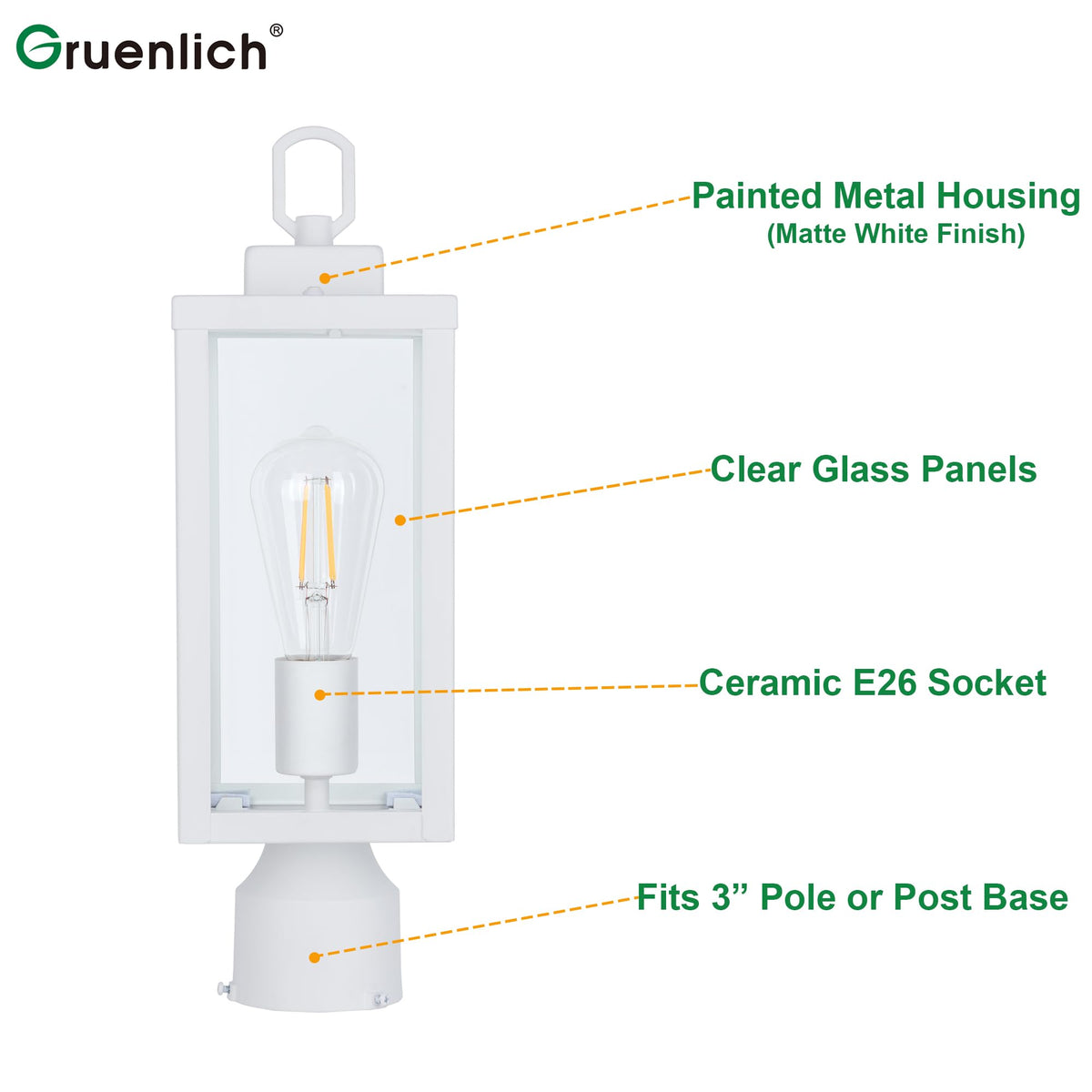 GRUENLICH Outdoor Post Lighting Fixture Pole Lantern, E26 Medium Base Max 60W, Metal Housing Plus Glass, Matte White Finish, Bul