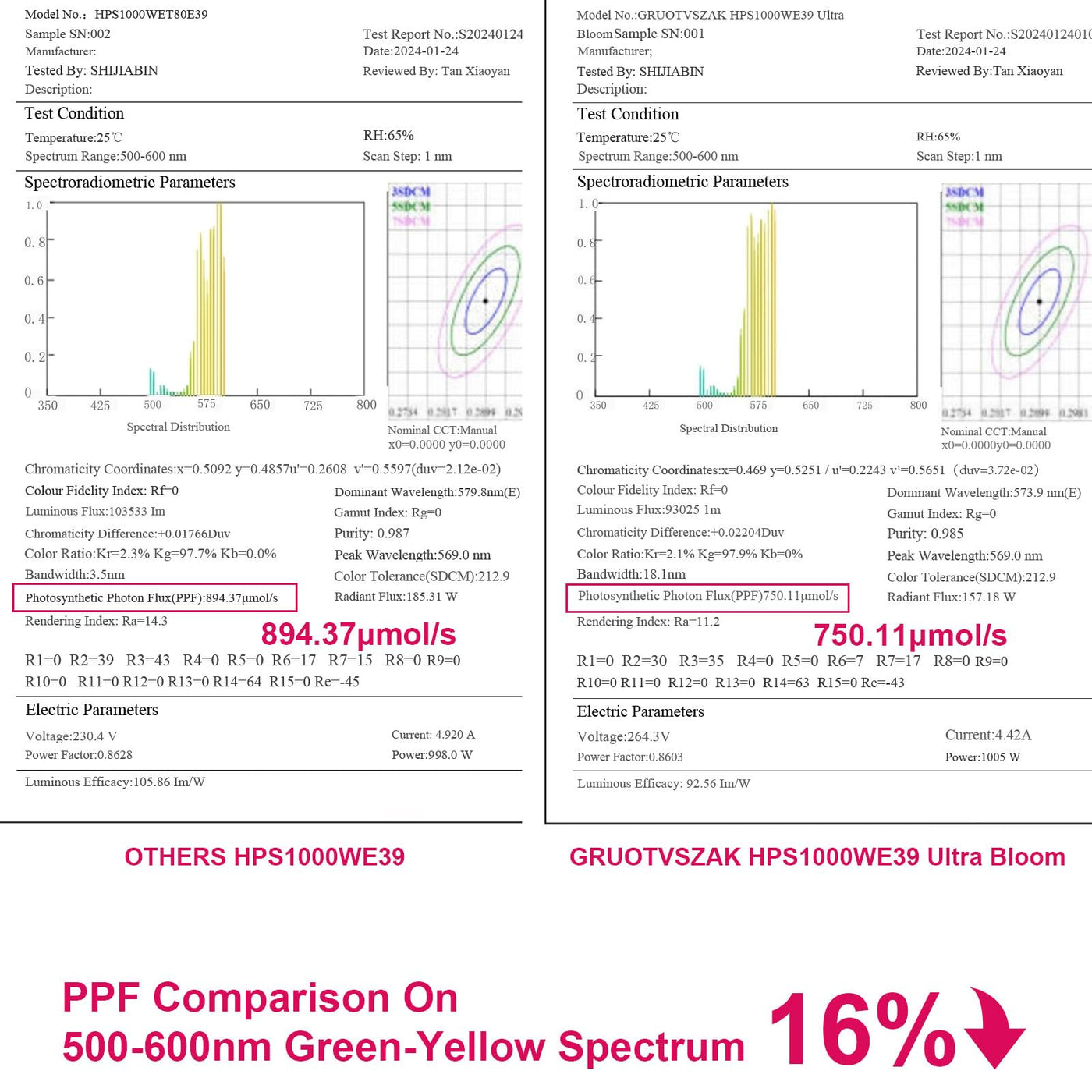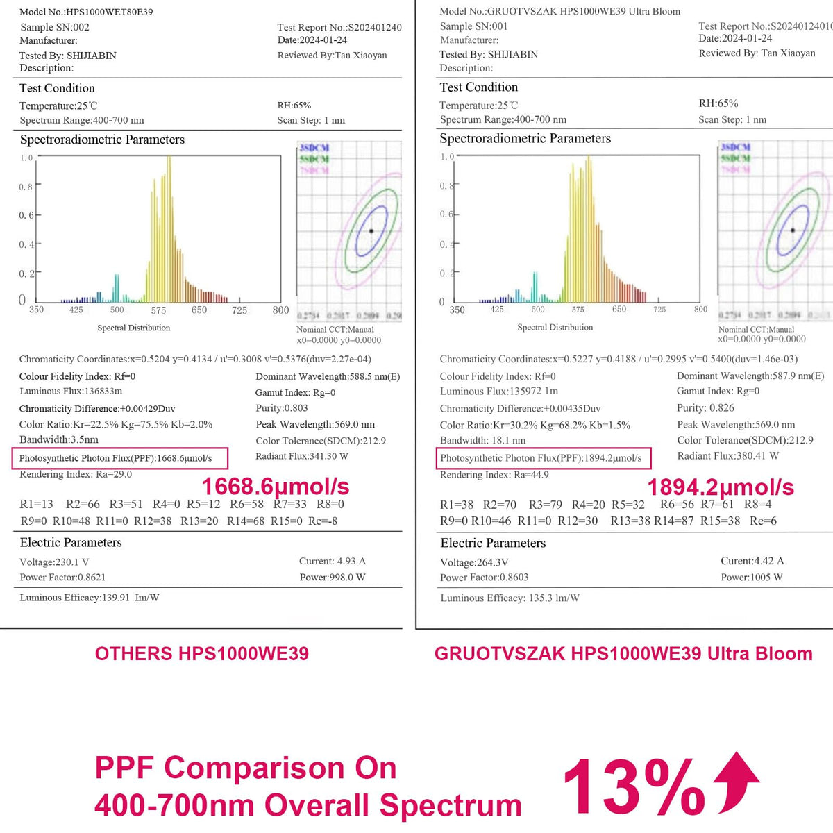 Q: How does the RED spectrum benefit plant growth?A: The bulb focuses 60% of its PAR on the RED spectrum, which enhances light utilization for photosynthesis, particularly during the blooming stage, resulting in bigger buds and higher yields.