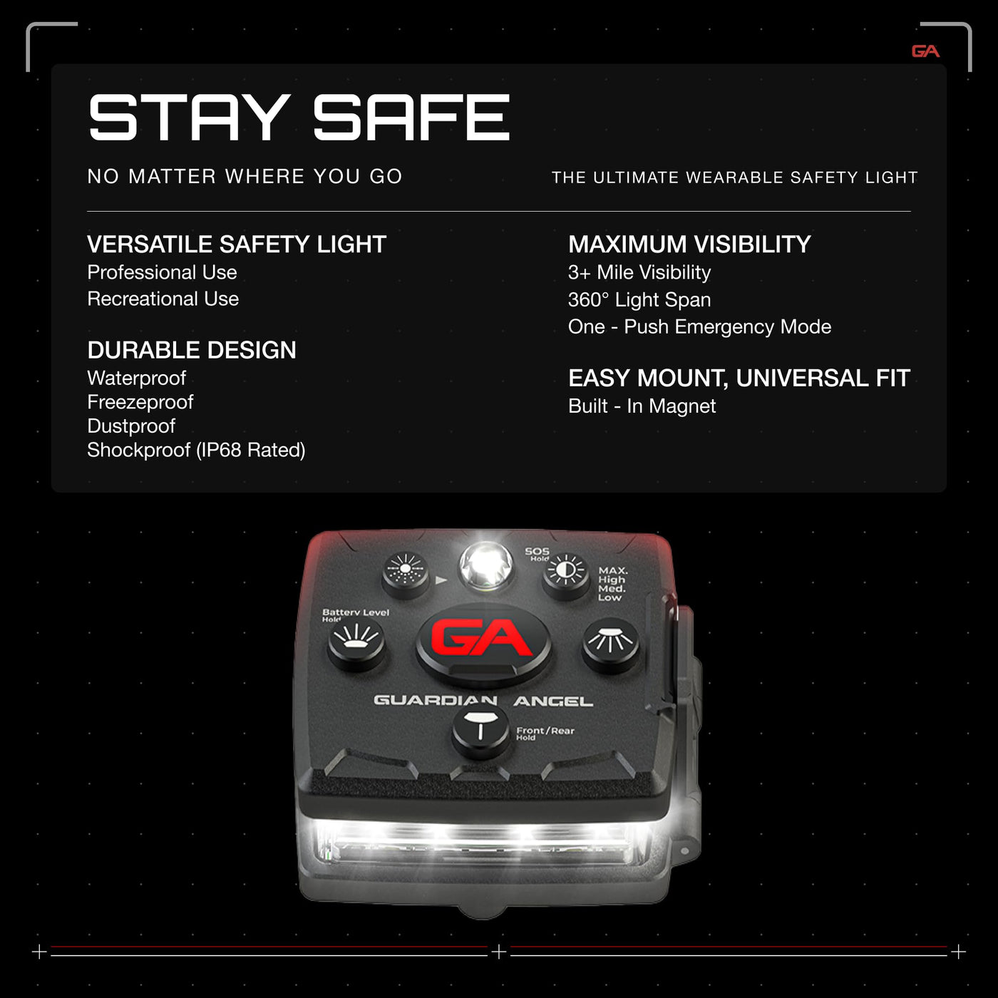 Get Home Safe: Each detail in the Guardian Angel Micro Series hands-free, wearable, multi-mountable safety light was designed with your safety in mind. Featuring professional-grade construction & lighting on all sides thats visible for miles, the Micro keeps you safe and doubles as a hands-free work light. Organizations and outdoor enthusiasts in the US and around the world trust the Micro Series to keep them and their families visible and safe in any situation. Measures 5.05 x 4.37 x 1.73 cm.