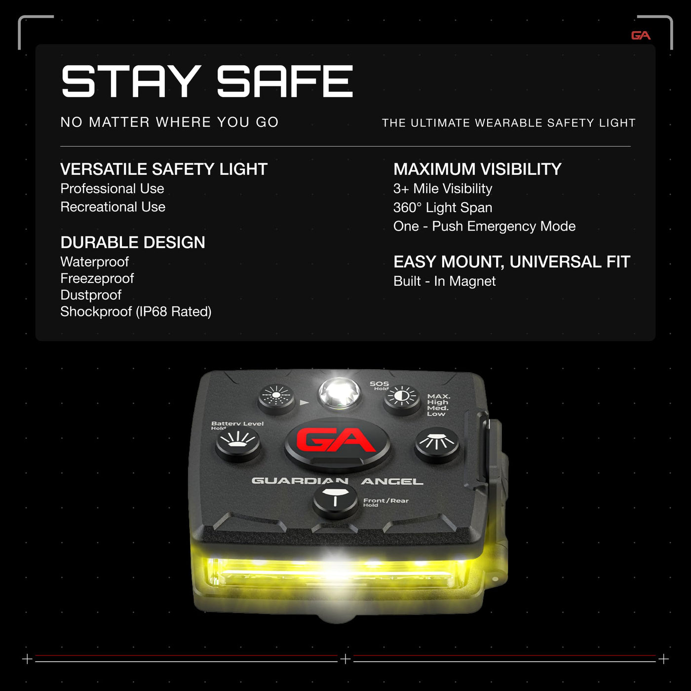 Get Home Safe: Each detail in the Guardian Angel Micro Series hands-free, wearable, multi-mountable safety light was designed with your safety in mind. Featuring professional-grade construction & lighting on all sides thats visible for miles, the Micro keeps you safe and doubles as a hands-free work light. Organizations and outdoor enthusiasts in the US and around the world trust the Micro Series to keep them and their families visible and safe in any situation. Measures 5.05 x 4.37 x 1.73 cm.