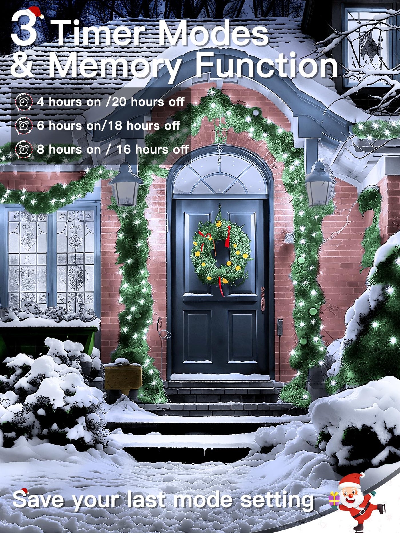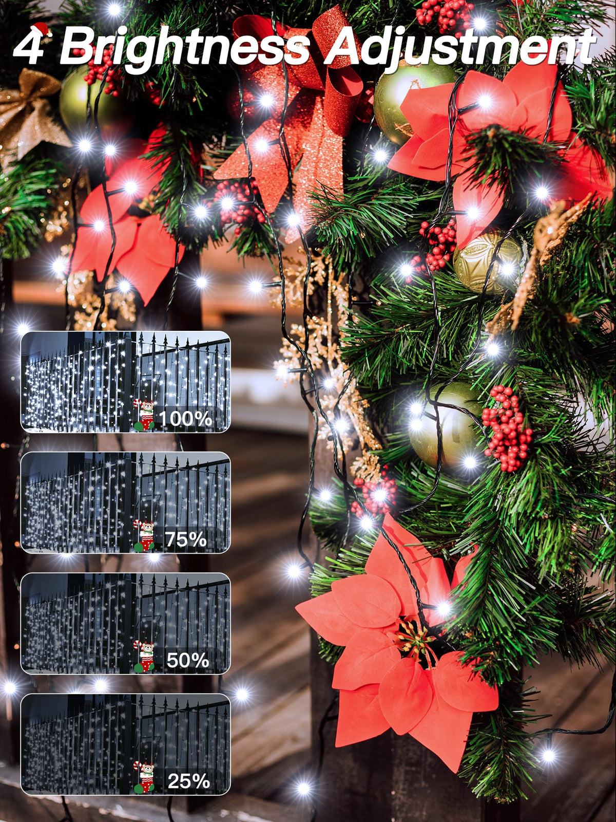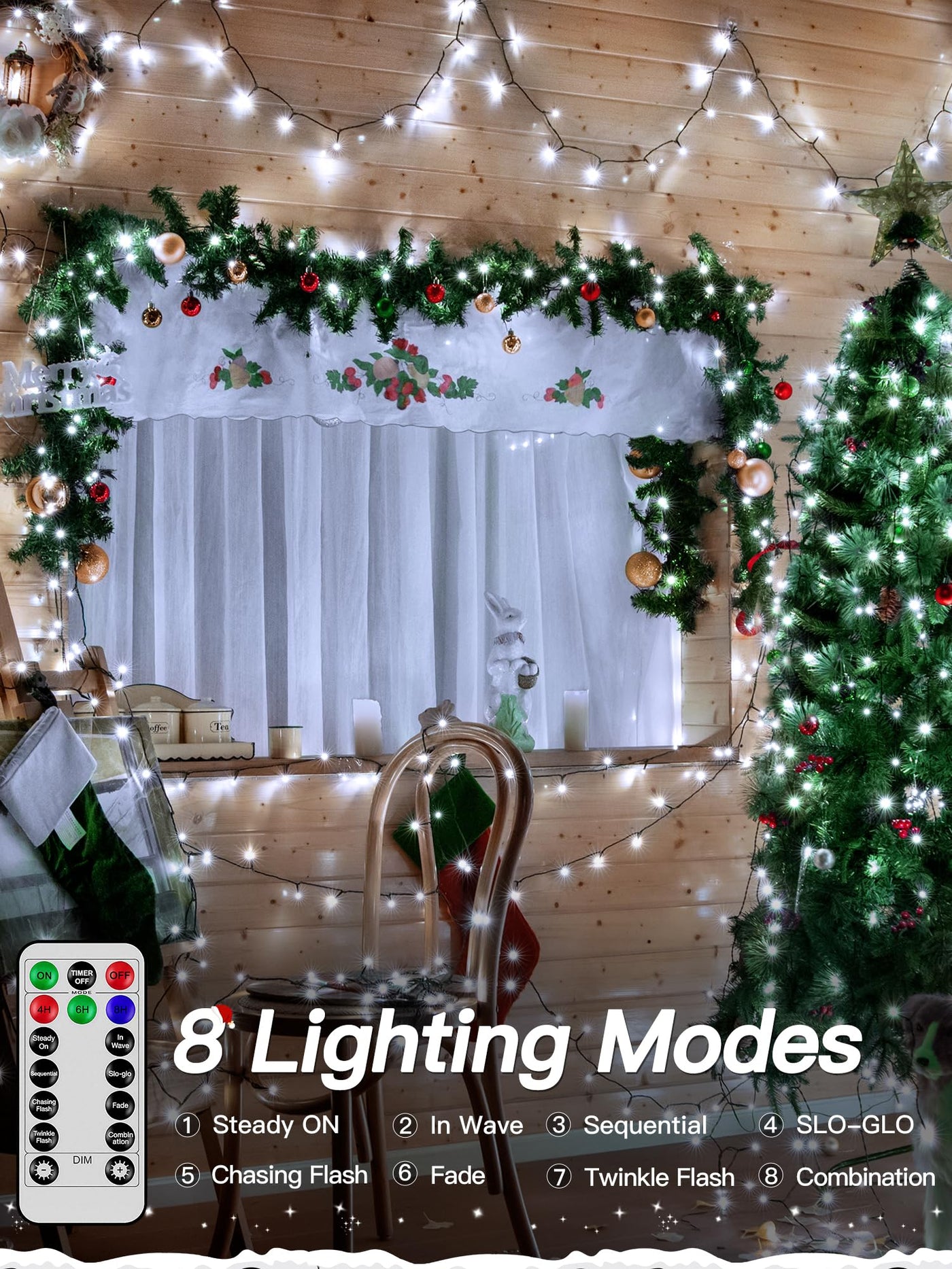 Why Choose Our Christmas Lights For Tree ? 1: The Led Christmas Tree Lights Are 200 Led 66 Ft In Length And Emit A Red And Green Glow That Will Create A Holiday Atmosphere In Your Space; The Lights Are Extra Bright And Perfect For Both Indoor And Outdoor Decorations. 2: The Outside Christmas Lights Has 8 Lighting Modes (Steady On In Wave Sequential Slo-Glo Chasing Flash Fade Twinkle Flash Combination); With Remote You Can Easily Customize The Lighting Mode To Match Different Occasions. 3: The Outdoor Led Christmas Lights Features 3 Timer Function (4 Hrs On &Amp; 20 Hrs Off); (6 Hrs On &Amp; 18 Hrs Off); (8 Hrs On &Amp; 16 Hrs Off ); The Lights Also Come With A Built-In Memory Chip That Will Save The Previous Mode Settings. 4: The Outdoor Xmas Lights Have 4 Brightness Adjustments Range From 25% 50% 75% To 100%; You Can Adjust The Different Brightness Of The String Fairy Lights By Remote Control To Suit Different Scenes. 5: The Christmas Led Lights Are Certified By Ul588 Operate At 29V Low-Voltage Making Them Safe To Touch When On; With Ip44 Waterproof Rating The Lights Remaining Bright And Sparkling Even During Extreme Weather.&Nbsp; Specification: Length: 66 Ft Voltage: 29V Material: Plastic Power: 6W Dimmable: 4 Dimmable Ways With Remote Control Waterproof Grade: Ip44 Mode: 8 Lighting Modes Quantity Of Bulbs: 200 Led Package Included: 1 X Chrismtas String Lights 1 X User Manual 1 X Remote Control