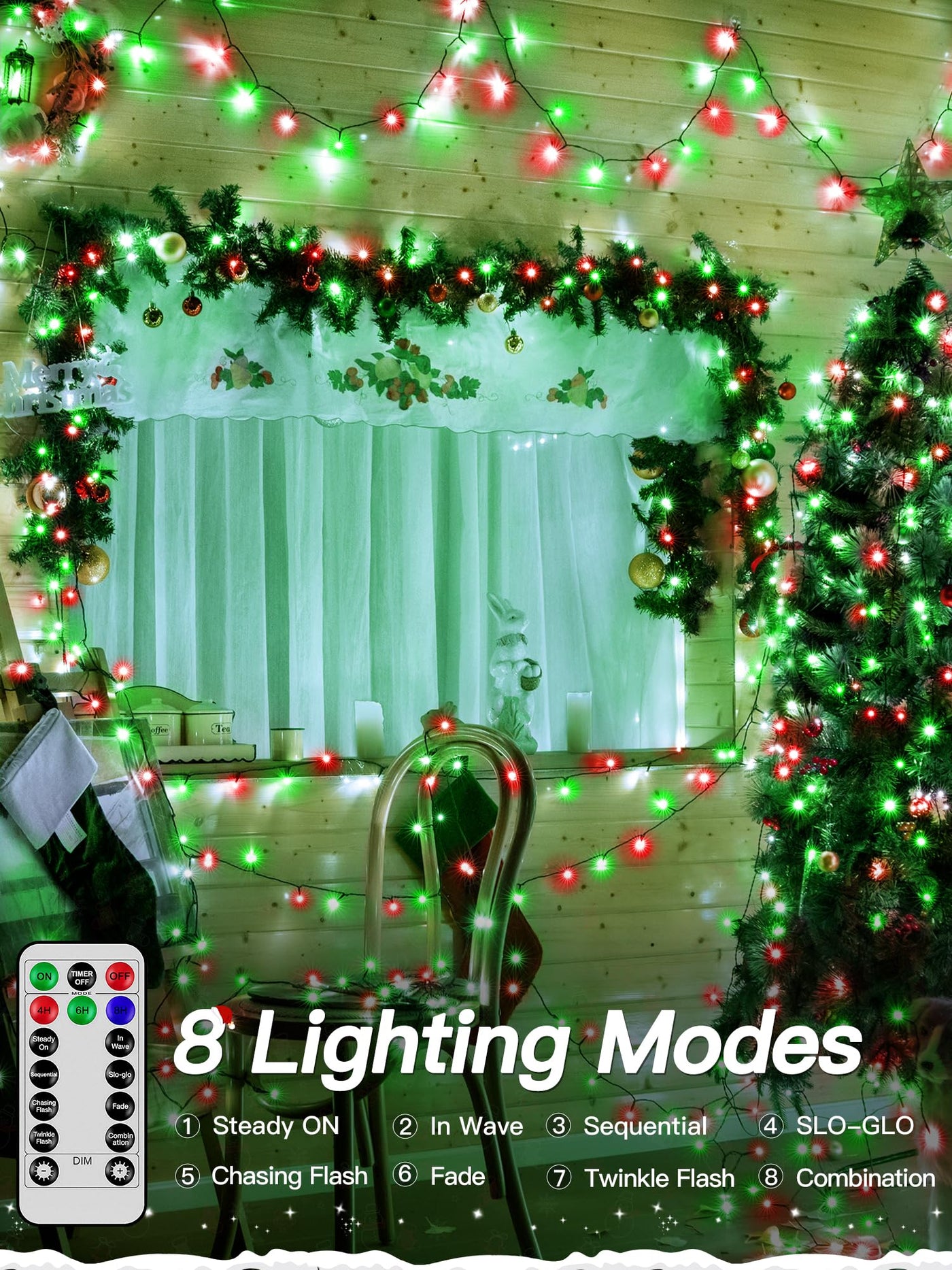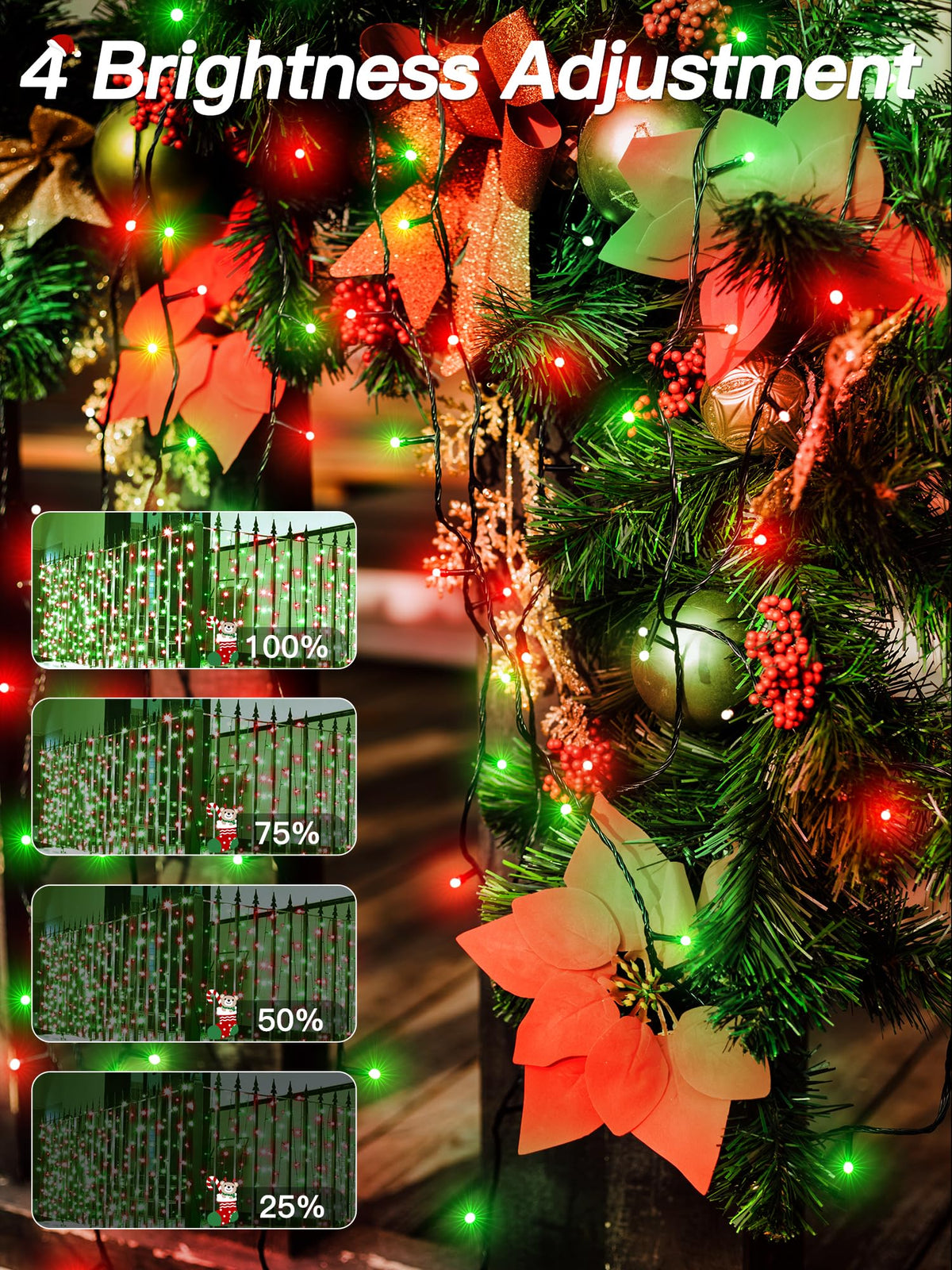 Why Choose Our Christmas Lights For Tree ?1: The Led Christmas Tree Lights Are 200 Led 66 Ft In Length And Emit A Red And Green Glow That Will Create A Holiday Atmosphere In Your Space; The Lights Are Extra Bright And Perfect For Both Indoor And Outdoor Decorations.2: The Outside Christmas Lights Has 8 Lighting Modes (Steady On In Wave Sequential Slo-Glo Chasing Flash Fade Twinkle Flash Combination); With Remote You Can Easily Customize The Lighting Mode To Match Different Occasions.3: The Outdoor Led Christmas Lights Features 3 Timer Function (4 Hrs On &Amp; 20 Hrs Off); (6 Hrs On &Amp; 18 Hrs Off); (8 Hrs On &Amp; 16 Hrs Off ); The Lights Also Come With A Built-In Memory Chip That Will Save The Previous Mode Settings.4: The Outdoor Xmas Lights Have 4 Brightness Adjustments Range From 25% 50% 75% To 100%; You Can Adjust The Different Brightness Of The String Fairy Lights By Remote Control To Suit Different Scenes.5: The Christmas Led Lights Are Certified By Ul588 Operate At 29V Low-Voltage Making Them Safe To Touch When On; With Ip44 Waterproof Rating The Lights Remaining Bright And Sparkling Even During Extreme Weather.&Nbsp;Specification:Length: 66 Ftvoltage: 29V Material: Plasticpower: 6Wdimmable: 4 Dimmable Ways With Remote Controlwaterproof Grade: Ip44Mode: 8 Lighting Modesquantity Of Bulbs: 200 Ledpackage Included:1 X Chrismtas String Lights1 X User Manual1 X Remote Control