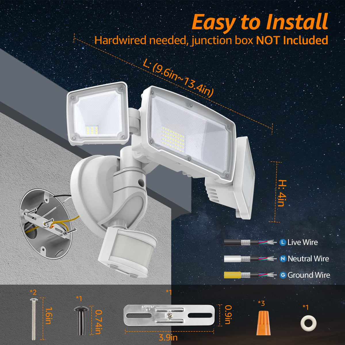 Q: How does the motion detection feature work?A: The motion detection feature utilizes advanced sensors to detect movement within a designated range. Once motion is detected, the lights automatically turn on, providing enhanced security and convenience for outdoor areas such as porches, driveways, and backyards.