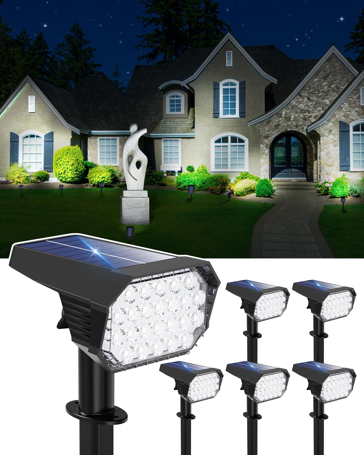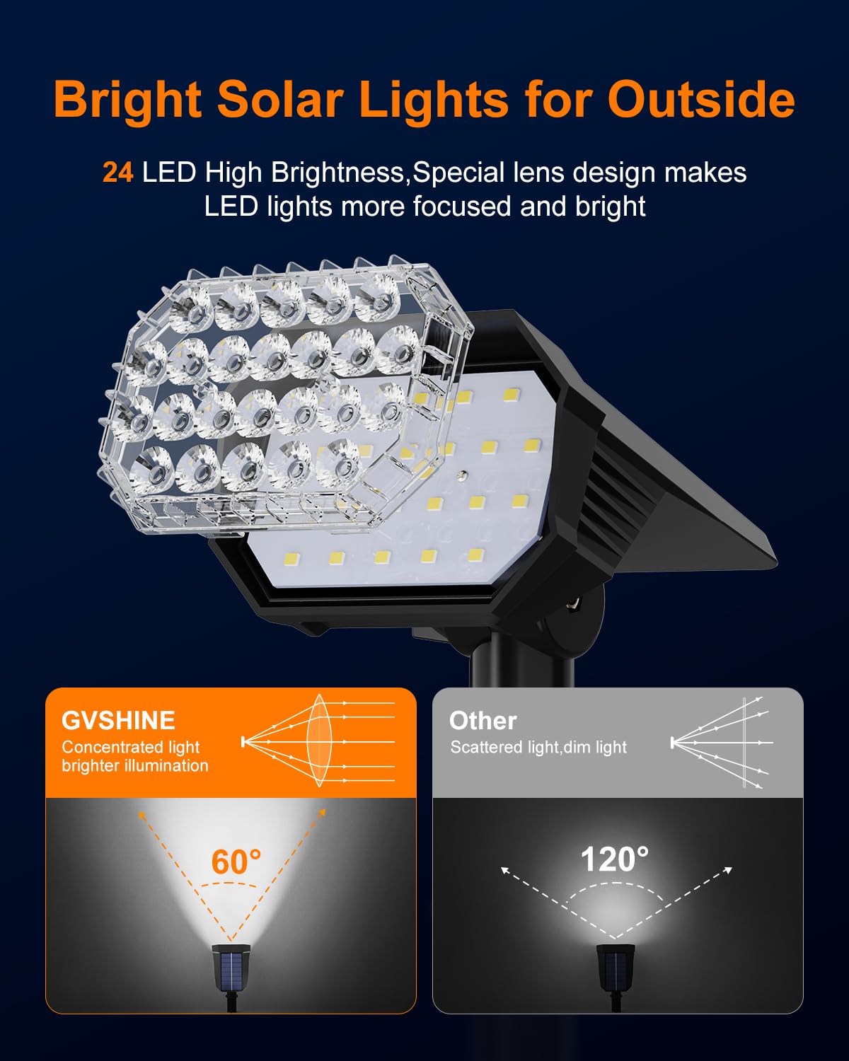 Illuminate your outdoor spaces with the GVSHINE Outdoor Solar Spot Lights, featuring a remarkable 24 bright LED lights designed to enhance visibility and security in your yard. These solar-powered lights are equipped with a high-efficiency solar panel, boasting a conversion rate of up to 20%, ensuring a reliable performance day and night.