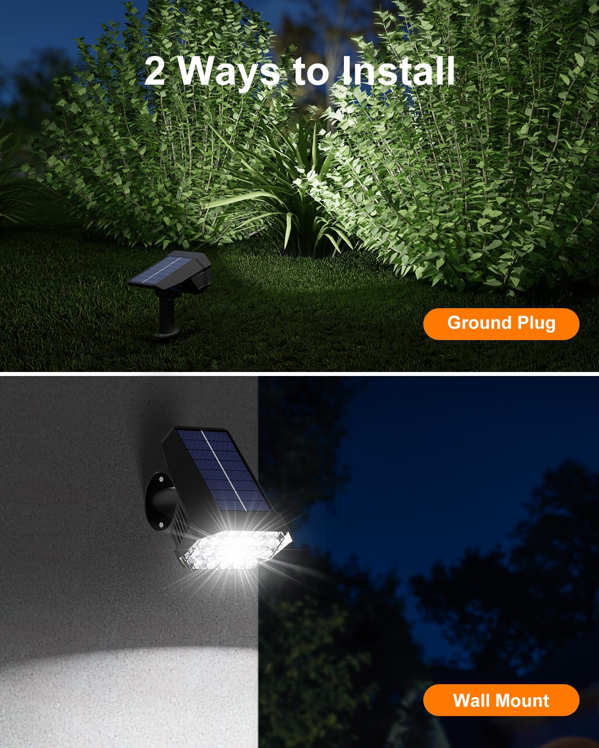 Q: How do I install the solar powered outdoor spotlights?A: The solar powered outdoor spotlights can be installed using two methods: ground stake installation for soft soil or wall mounting for firm surfaces. Choose the method that best suits your outdoor area for optimal placement and lighting.