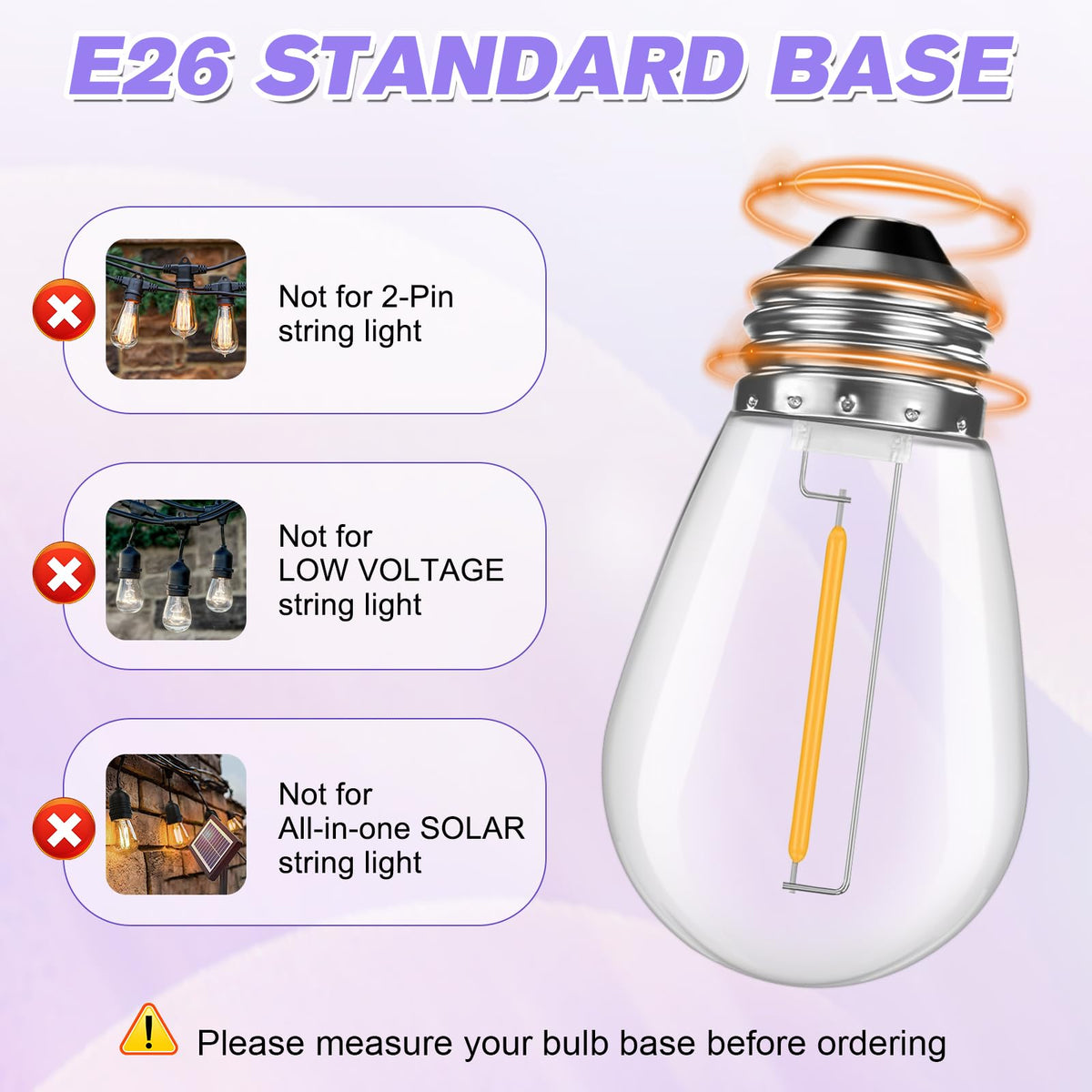 Enhance Outdoor Ambiance: S14 bulbs for outdoor string lights emit a warm 2200K glow, perfect for patios, backyards, bistros, balconies and caf