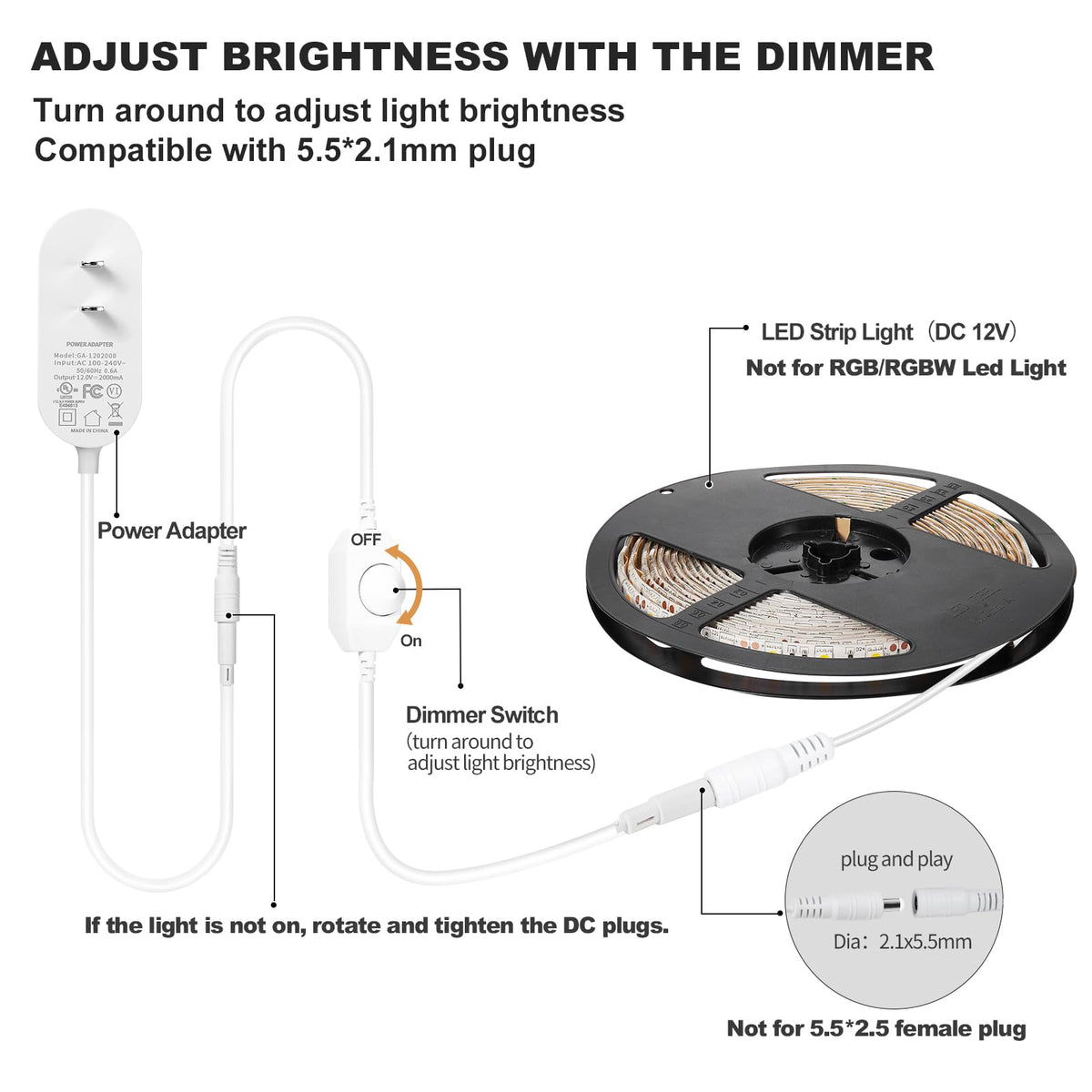 12v Power Supply with Dimmer Specification: Input: class 2 transformer 120v 60hz Output Voltage: dc in 12v power cord Output Current: 0 - 2A Maximum Power: 24 WattDC Power Cord: 5.0 Feet (1.5 Meters) DC Male Barrel Plug: 5.5X2.1mm; interior 2.1mm, exterior: 5.5mm (Center Positive)Operation Temperature: -10? to 40?CStorage Temperature: -20? to 85? Feature: ON OFF dimmer switch easy to control the power UL PSE RoHS Listed Compliant Lead Free (Safety & Environmental Certificate) Built in Chip with stable functionShort Circuit,Over-Current,Over-Voltage,Input Output Protection - High Efficiency Level: VI:90% , Save 15%-20% Electricity Charge)ABS and PC Flame-retarded Material Case >Double-sided Circuit Board Design Shockproof Packing Box Applications:12 volt 2 amp power supply for DC 12V single colour or RGB LED strip light,led tape lightled under cabinet light,counter light,desk light,stair light Cable Modem, Router,DVR NVR Surveillance System,Security CCTV Camera,IP camera Arduino PCB Design,Computer Speakers,Digital Photo Frame,External Hard Drive Foot Back Neck Shoulder Massager,Fresh Water Bilge Air Pump And other devices whose 12Vdc does not exceed 2A 24W Package Content:1 X 12v 2A power adapter 1 X dimmer switch 1 X DC Female led plug adapter1 X User manual