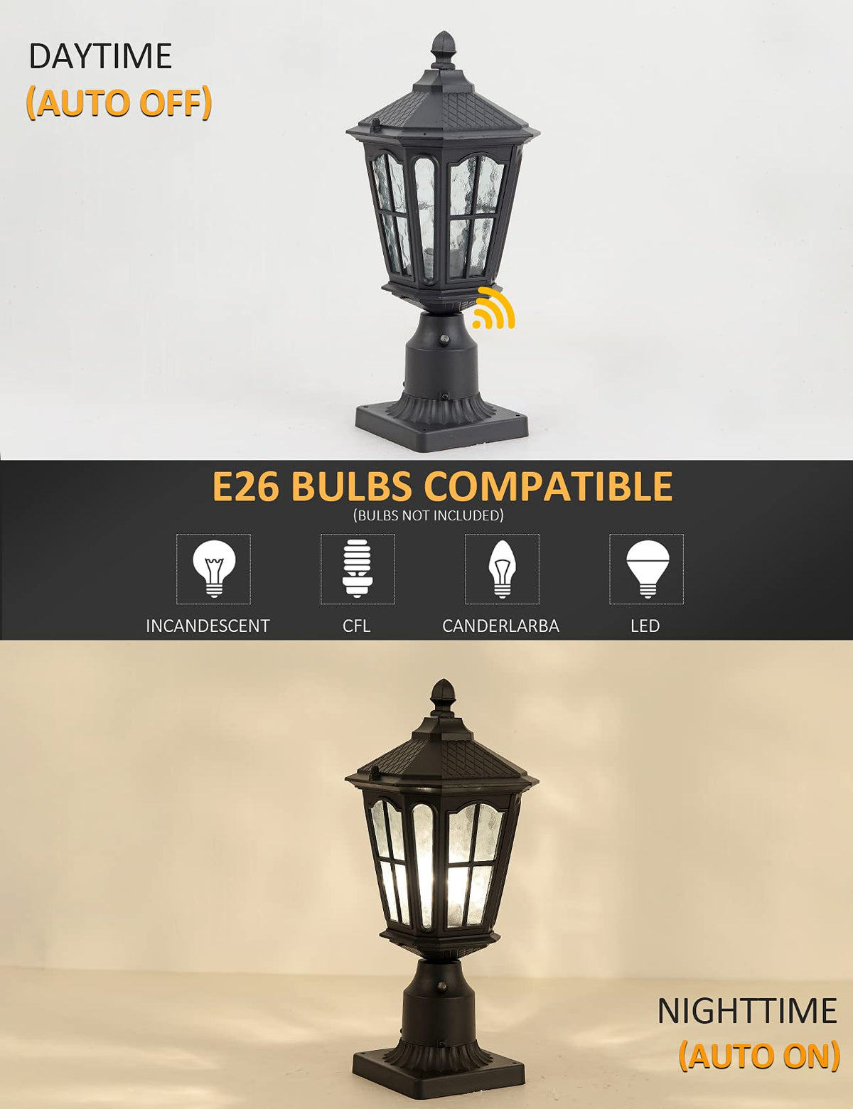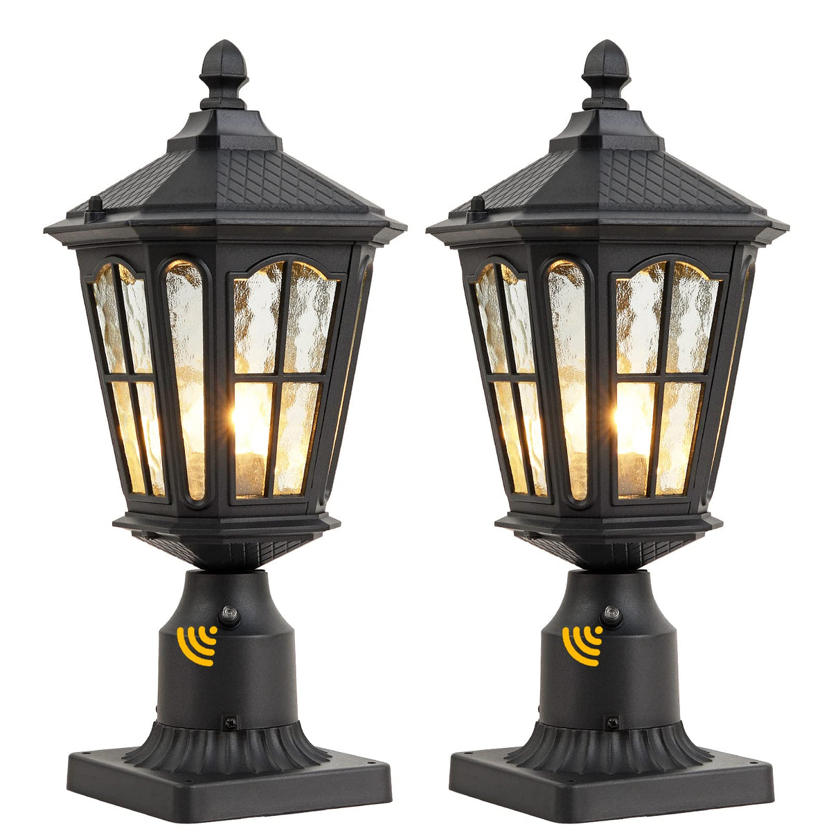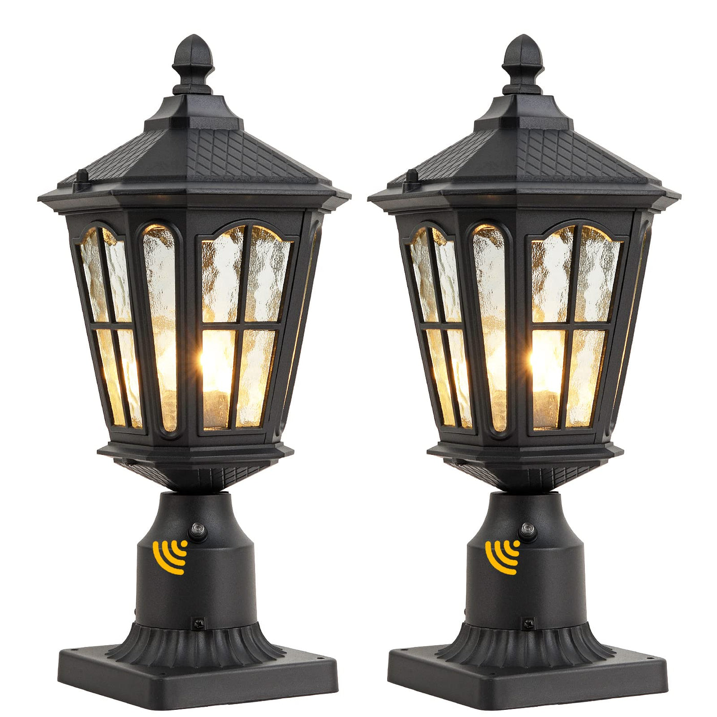 Where to Place Outdoor Post Light? Do you need a pair of post light flanking each side of the courtyard, in patios, courtyard, outdoor garden and entryway, and other outdoor spaces? This outdoor post lantern features solid metal construction and unique Crackle Glass, reflects an interesting and gorgeous light on the outside of your home. Provide warm atmosphere for your family, and a perfect complement for any features of house decors.Perfect for house/backyard/courtyard/front door/porch/patio/garden/balcony/entryway/garage! Specifications: Finish: Matte Black Intended Use: Outdoor courtyard use. Style: Rustic / Antique / Industrial. Installation Type: Hardwired. Material: Solid metal, Water Ripple Glass Voltage: 110V Post light dimensions: 17H x 7.09W x 7.09L ?Include mounting base? Mounting Base Dimensions(f 3-inch): 5.6 L x5.6 W x3.1 H?Allow 0.5inch error? Bulb Type: E26 Base(Bulb NOT included) Features Why choose our outdoor post light fixtures? - TWO-WAY use outdoor post top lighting fixture: Place this post top fixture on a 3 diameter post( Not included) or fix it with the mounting base (INCLUDED). - Waterproof Construction - Dustproof and waterproof, can prevent splashing water intrusion. Suitable for your outdoor lighting usage. - UL listed: The E26 base passes the UL safety test, reduces the loss of the bulb and prolongs the service life of the bulb. Compatible with all types of light bulbs. - Easy installation. Includes Installation instruction and all mounting hardware. One pack. Hard-wired. This is not a plug-in design.
