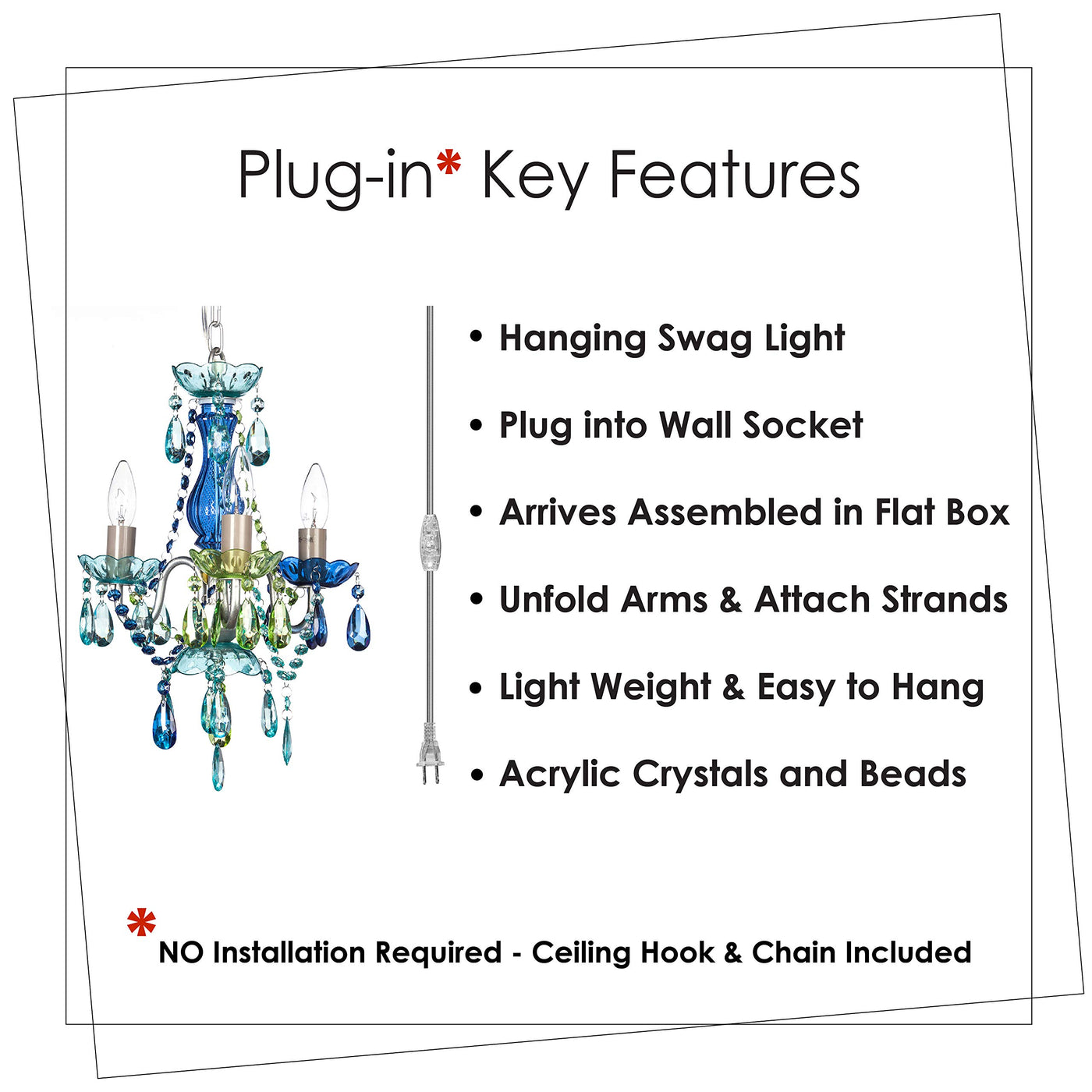 Gypsy Color 3-Light Plug-In Swag Chandelier, Blue Green Glass & Acrylic Crystals, Silver Frame