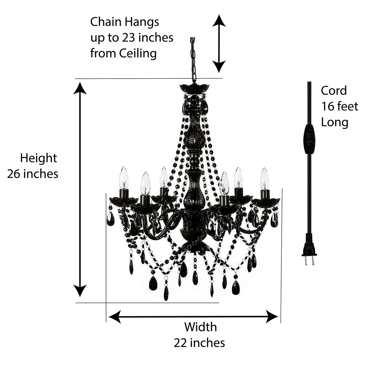 Gypsy Color Black Plug-In 6 Light Chandelier, Metal Frame & Acrylic Crystals, H26”Xw22”