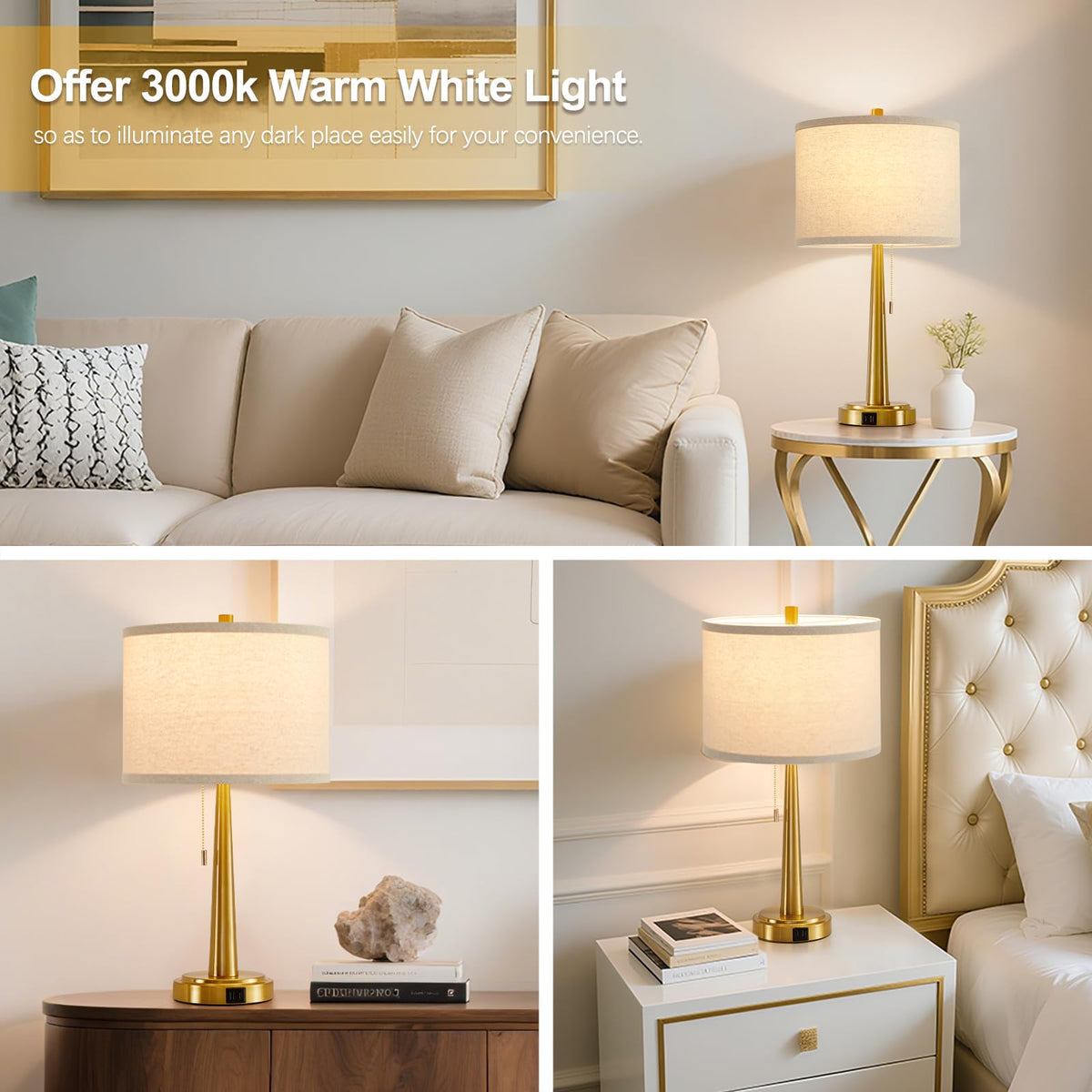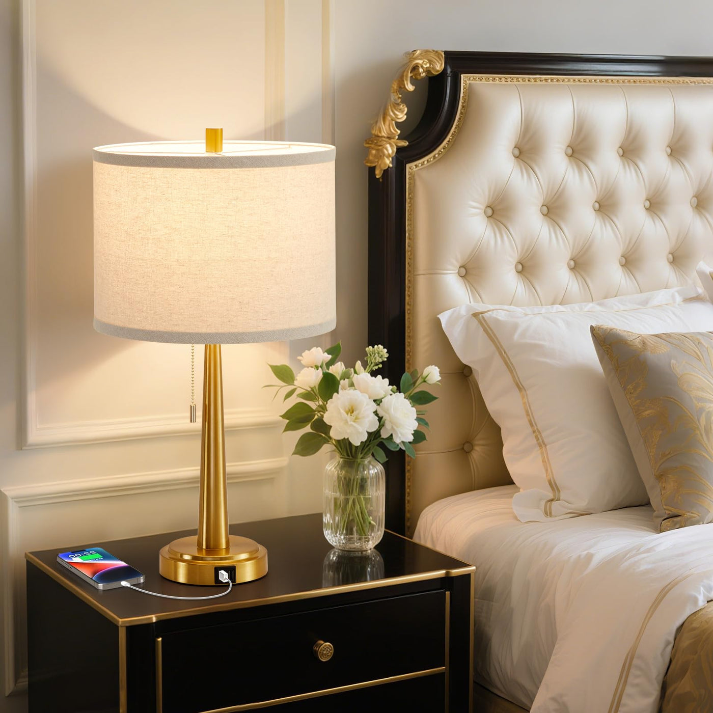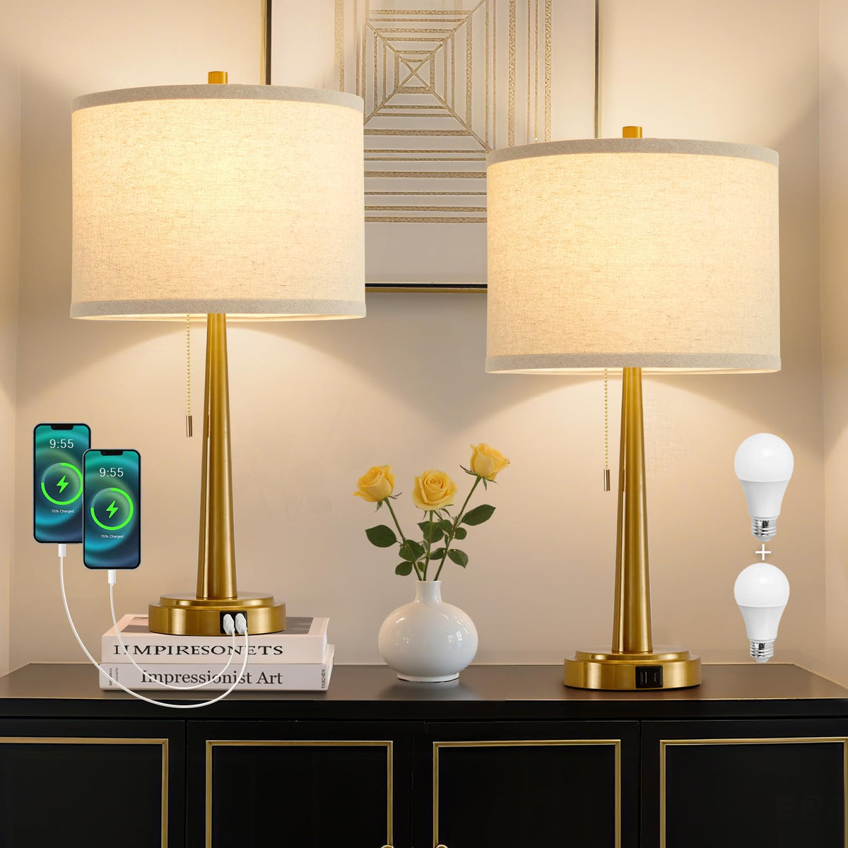 Gyrovu 22 Inches Table Lamps, Bedside Lamps With Usb And C Ports, Nightstand Lamp With Pull Chain, Gold Lamp Set Of 2 For Living