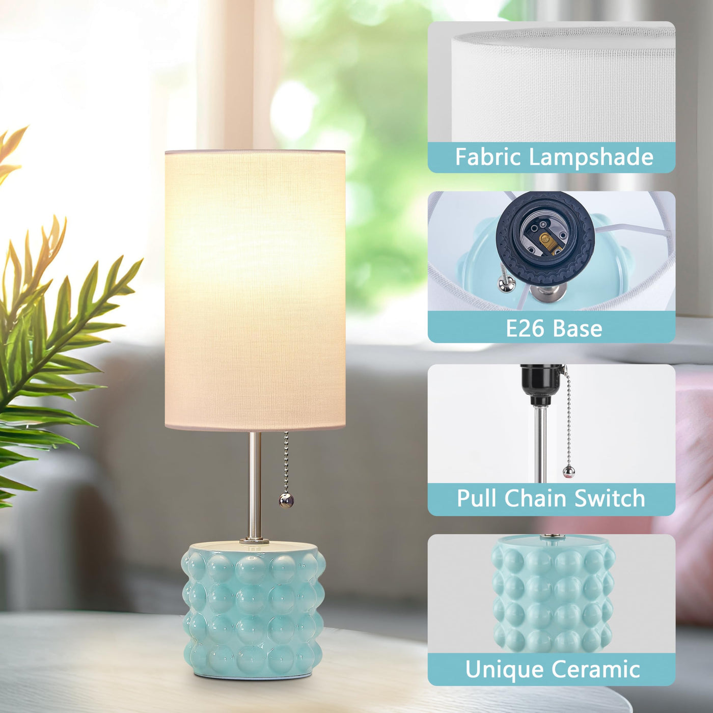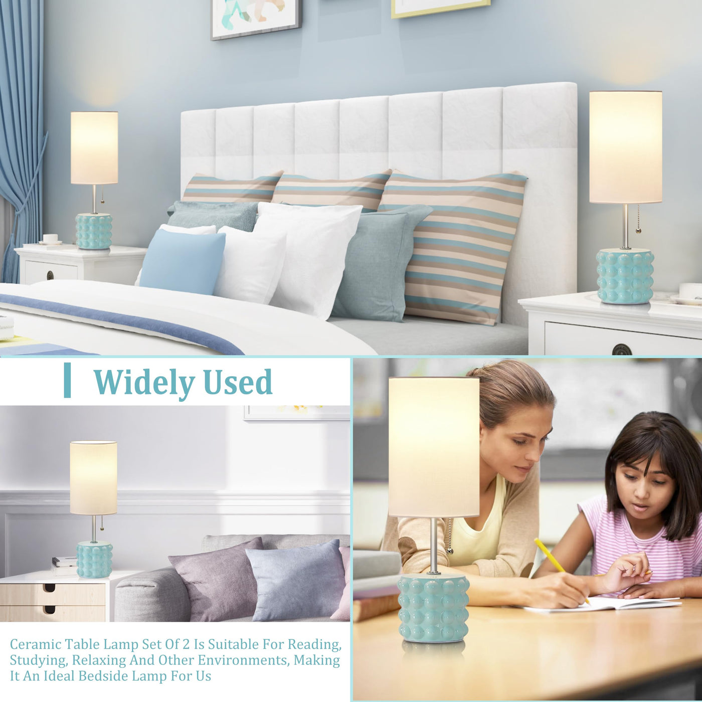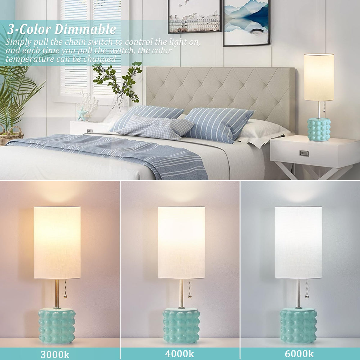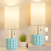 Gyrovu Ceramic Table Lamp Set Of 2, Small Bedside Table Lamps, Modern Pull Chain Nightstand Lamps With Fabric Shade, Blue Desk L