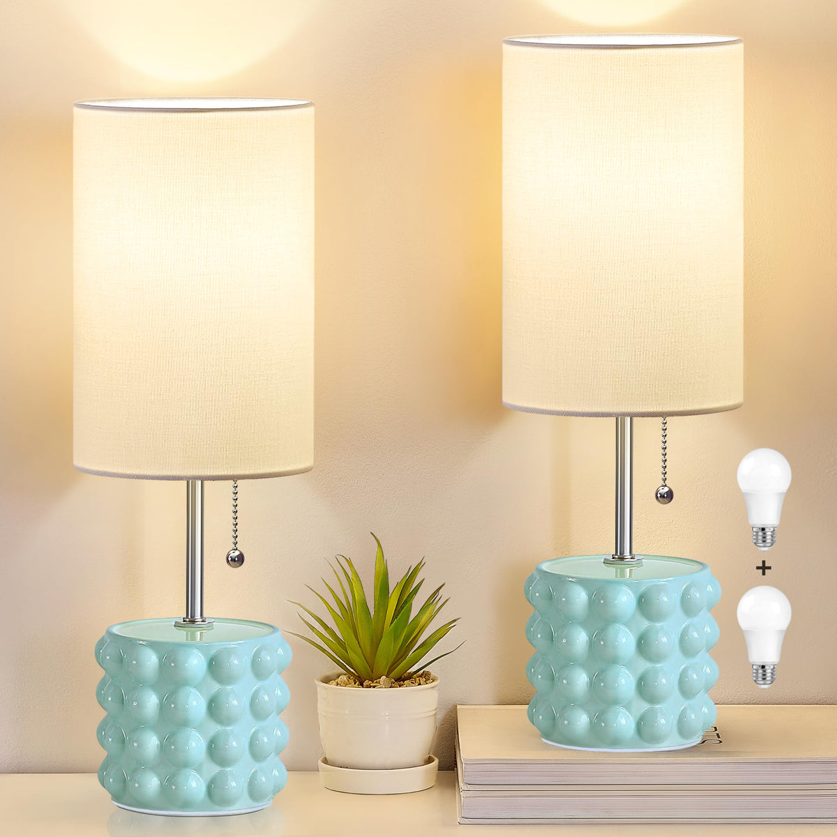 Q: Can I use LED bulbs with these lamps?A: Yes, the GyroVu ceramic table lamps come with two A19 LED bulbs included. They have an E26 base and are designed to be energy-efficient, saving you up to 90% on your electric bill compared to incandescent bulbs.