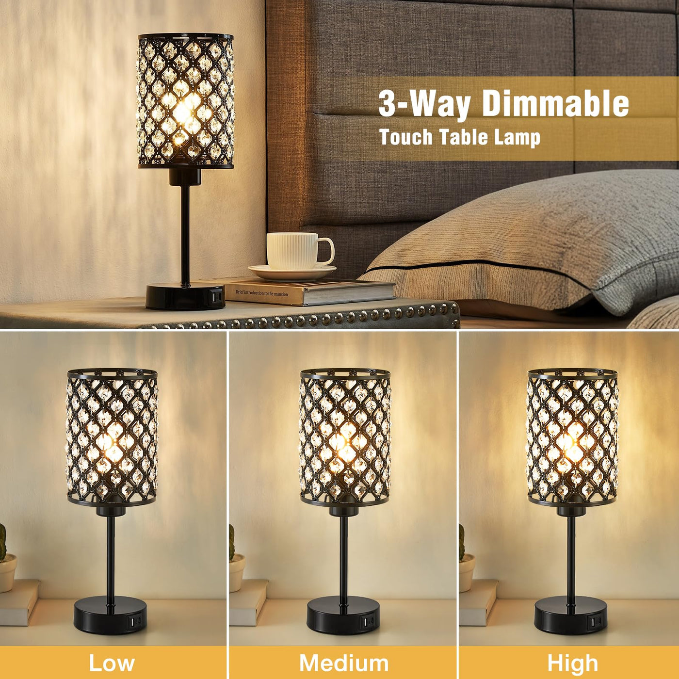 Gyrovu Crystal Table Lamp, Black Lamp For Bedroom Nightstand With Usb C+A Ports, 3 Way Dimmable Touch Lamp With Crystal Shade, B