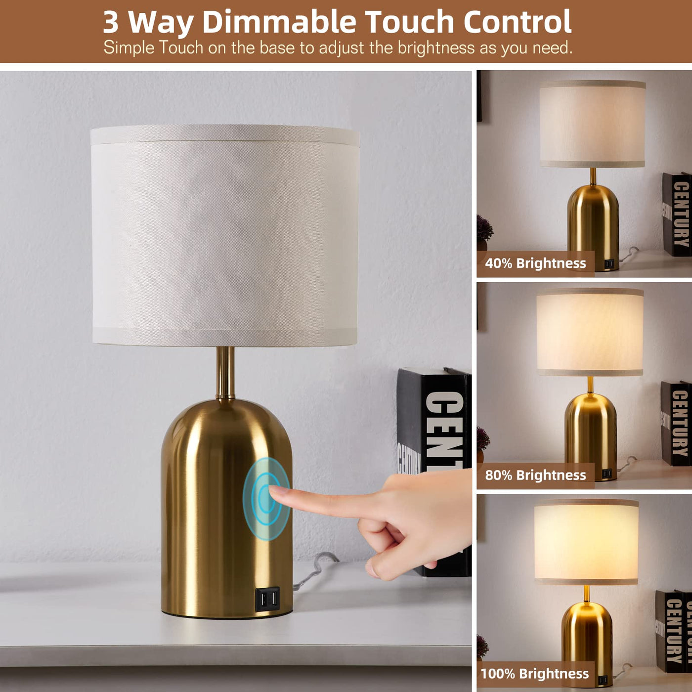 ?? This lamp set features a 3-way dimmable touch control function, allowing you to simply tap anywhere on the elegant gold metal base to adjust the lighting (low, medium, high, off). You can select the ideal brightness for various environments.
