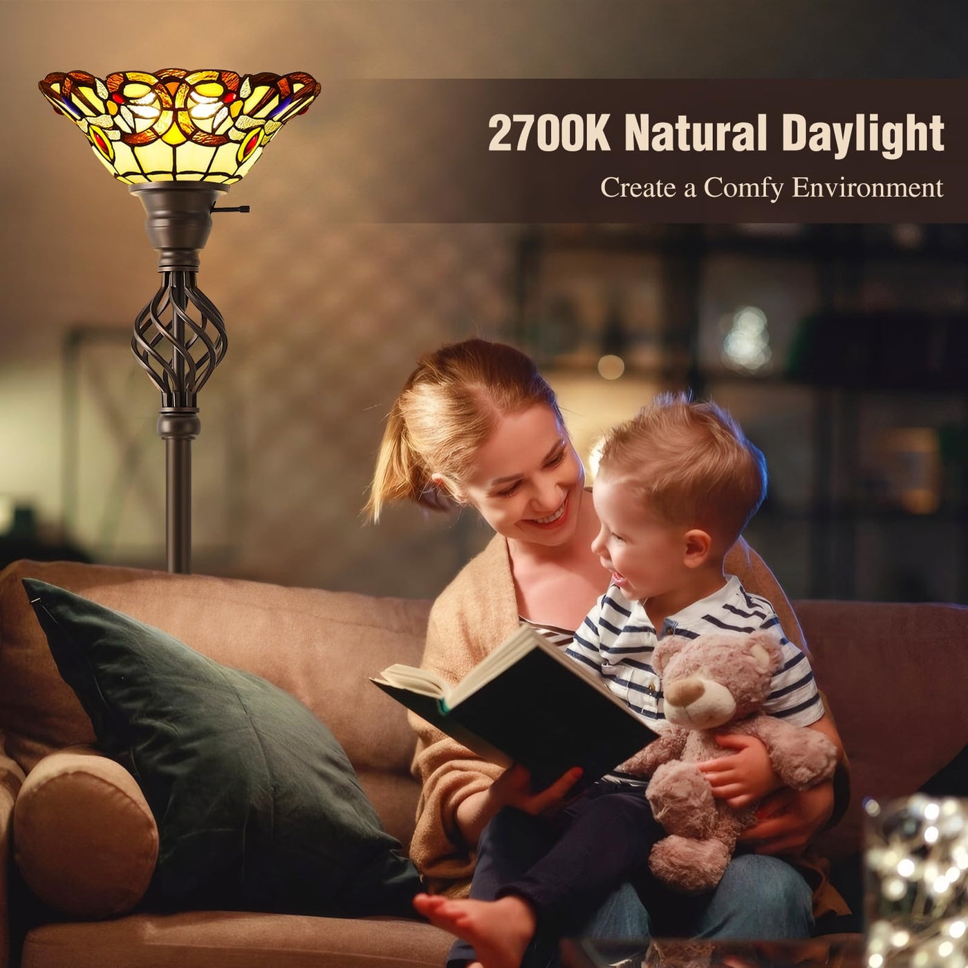 Q: What type of bulb does this floor lamp use?A: This lamp is equipped with a 9W A19 LED bulb, which has a lifespan of 50,000 hours. For the best lighting effect, warm white bulbs are recommended, enhancing the vibrant colors of the stained glass.