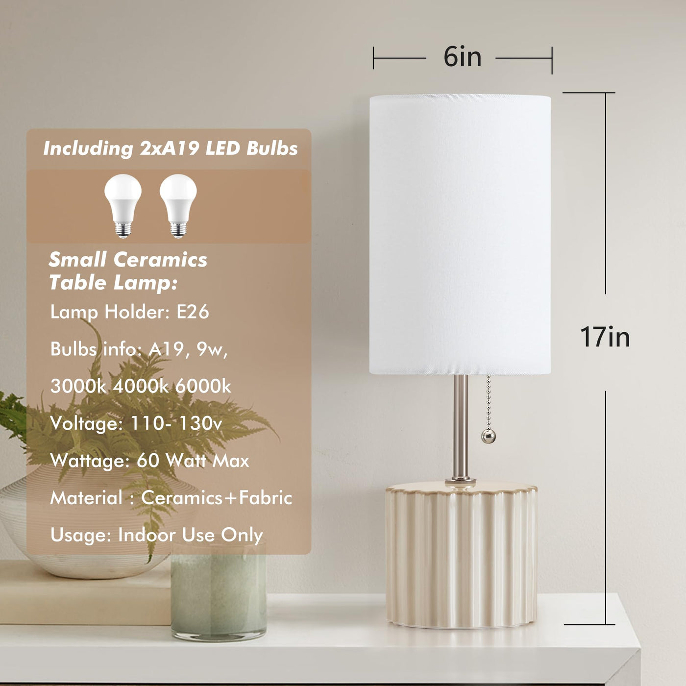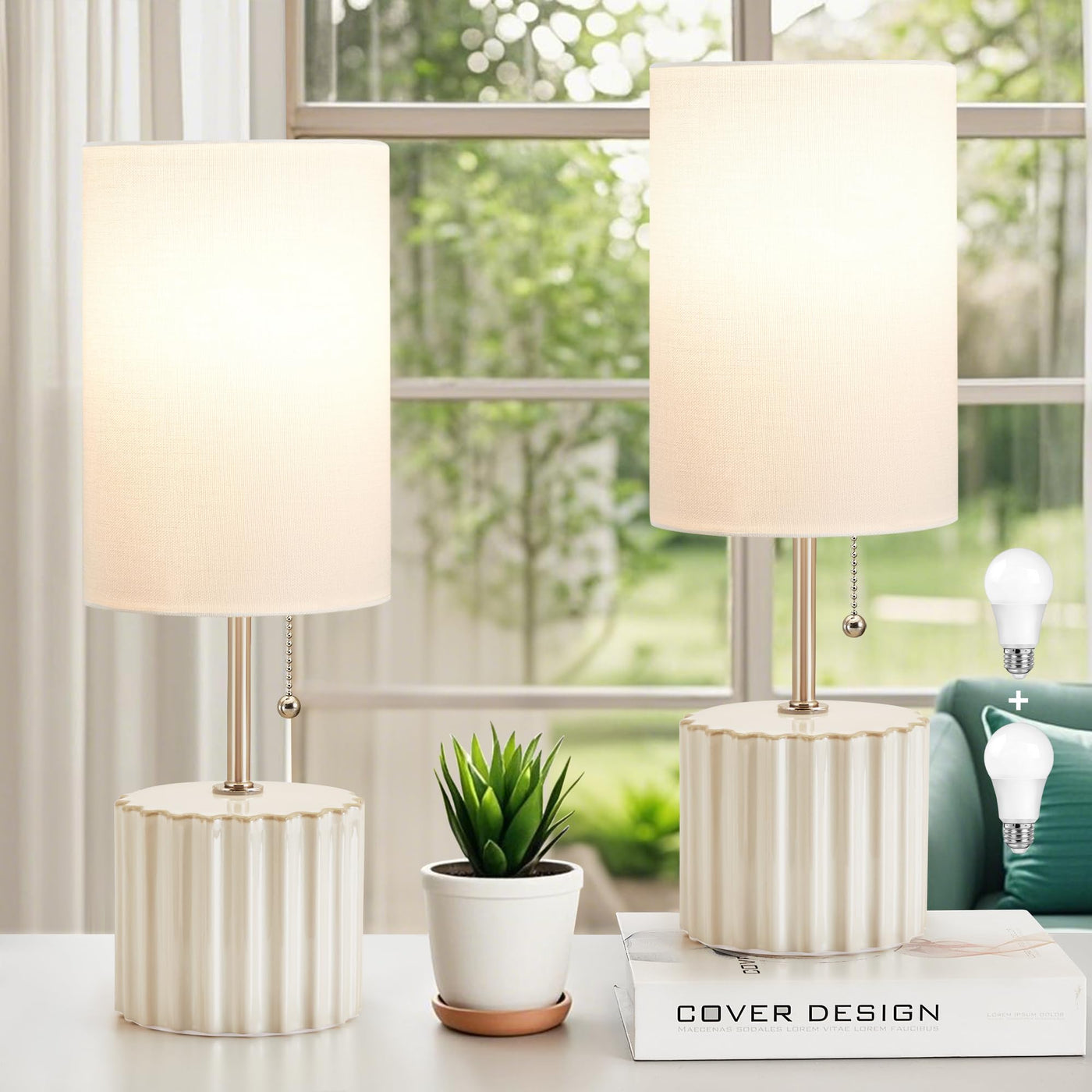 The GyroVu Ceramic Table Lamp Set of 2 is a stylish and versatile lighting solution designed specifically for small spaces. This set includes two ceramic lamps, perfect for adding a touch of sophistication to your bedroom or living room. Featuring a unique three-color temperature pull chain, these bedside lamps allow you to easily adjust the lighting to suit your mood or task. Whether you need bright and cool light for reading or warm and cozy ambiance for relaxation, these lamps have got you covered. With their compact size and sleek design, these small ceramic lamps seamlessly blend into any space, making them ideal for nightstands, side tables, or even desk surfaces. The elegant pink color adds a pop of vibrancy and charm to your decor, while the ceramic material provides durability and longevity. Included in this set are two light bulbs, ensuring that you can start using your lamps as soon as they arrive. The convenient pull chain switch allows for effortless on/off control, eliminating the need for fumbling with complicated switches or searching for a separate remote. Whether you're looking to create a cozy atmosphere in your bedroom or add a stylish accent to your living room, the GyroVu Ceramic Table Lamp Set of 2 is the perfect choice for small spaces. Upgrade your lighting game with these decorative and functional lamps that effortlessly enhance the ambience of any room