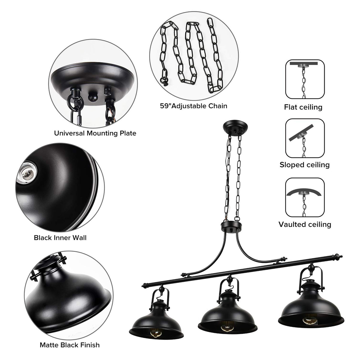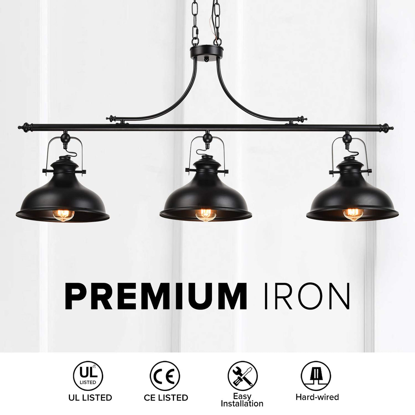 3-Lights Rustic Kitchen Island Pendant This Classic And Coastal-Style Island Light Has 3 Adorable Round Lighting Shapes In Matte Black Finish. Typical Farm House Style Look, Suitable To Use In Dining Room, Kitchen, Living Room, Above Pool Table Or Porch. Ce&Ul Listed With High Quality Sturdy Iron To Ensure Your Safe Use. Adjustable Chain And Compatible Canopy Make It Widely Used In Various Places. Its Definitely The Best Choice For Your Indoor Lighting Package Includes 1X 3-Lights Pendant 1X User Manual Mounting Hardware Included 3X E26 Base Bulb Not Included Specifications Power Source: Hardwired Material: Iron Color: Matte Black Operating Voltage: 110V-120V Power: Max. 60Watt Per Bulb Bulb Base: E26 (Bulbs Not Included) Dimmable: Not Dimmable