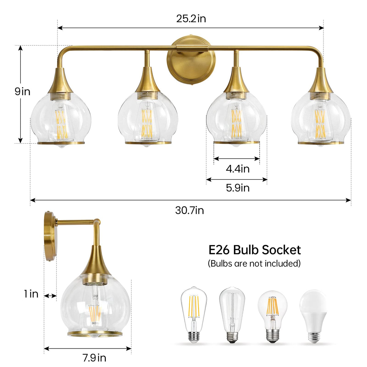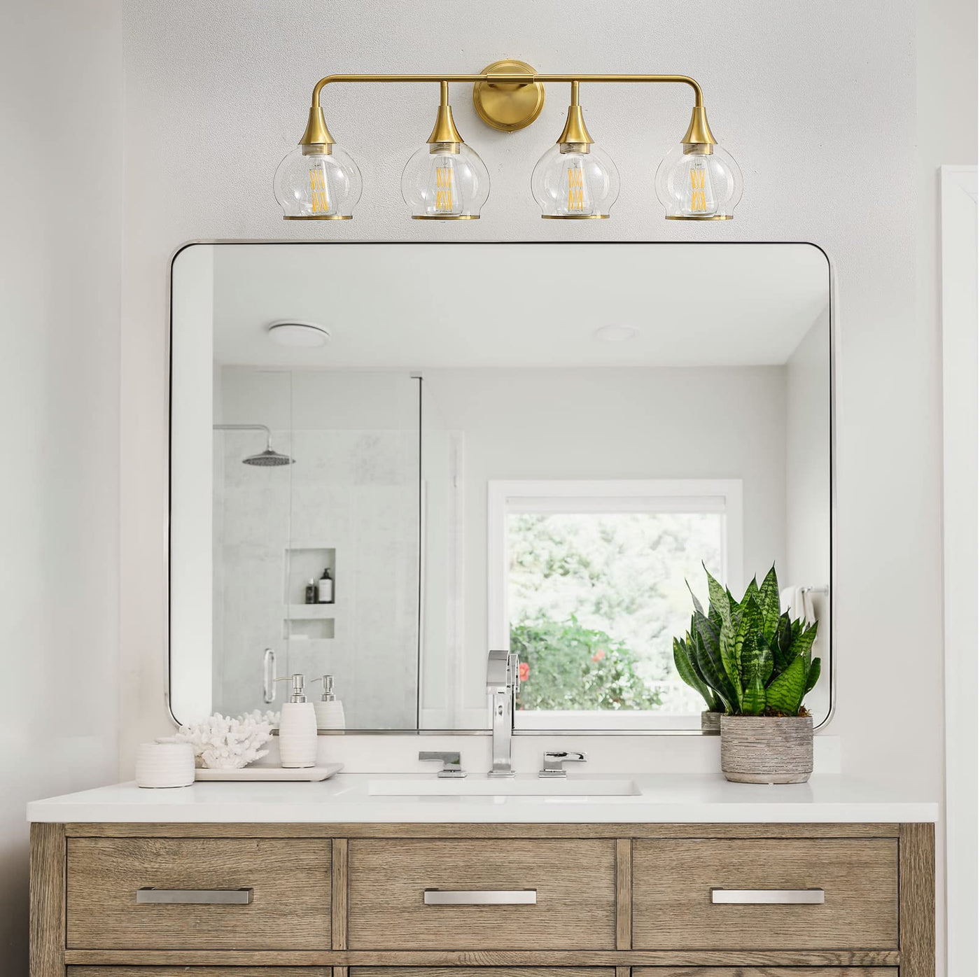 Hahzt Gold Bathroom Vanity Light 4-Light Bathroom Vanity Light Fixtures Over Mirror With Clear Glass Shade 30.7 Inch Wall Sconce