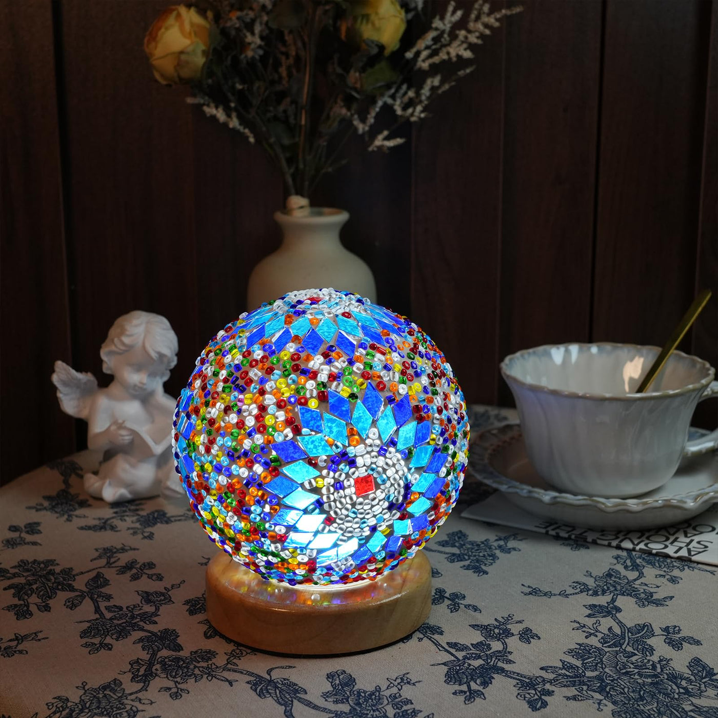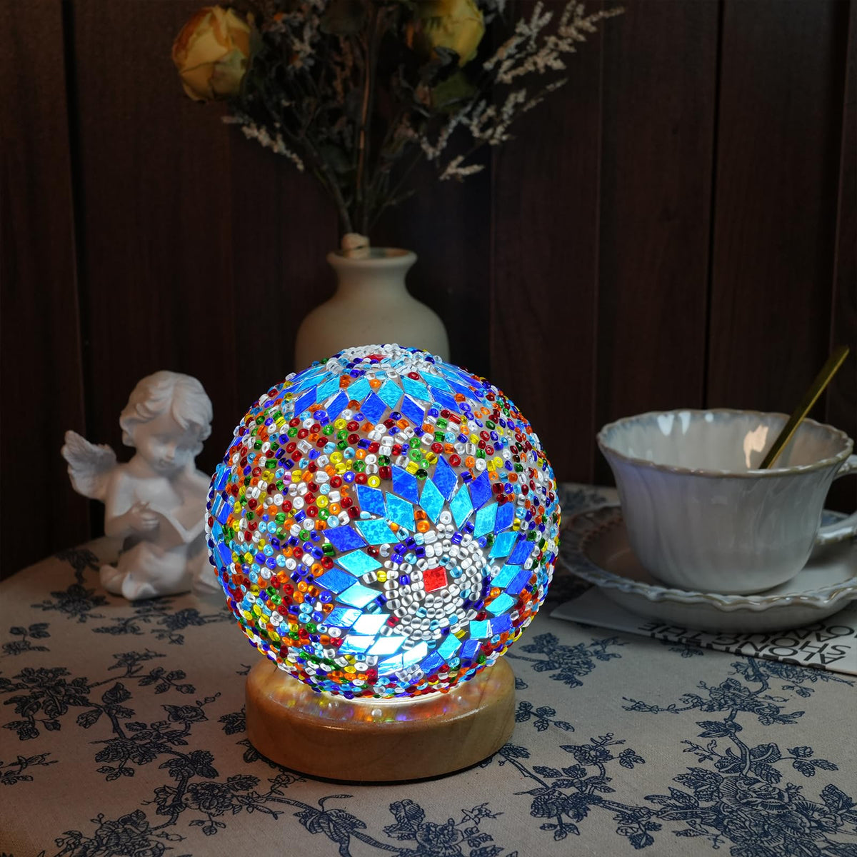 Haidoliang Turkish Table Lamp (D:4.7" X H:5.2"),Mosaic Glass Lamps With Wooden Base, Bohemian Tiffany Bedside Lamps, Usb Power Moroccan Lantern For Living Room Decorations (Boho - Blue, Boho)