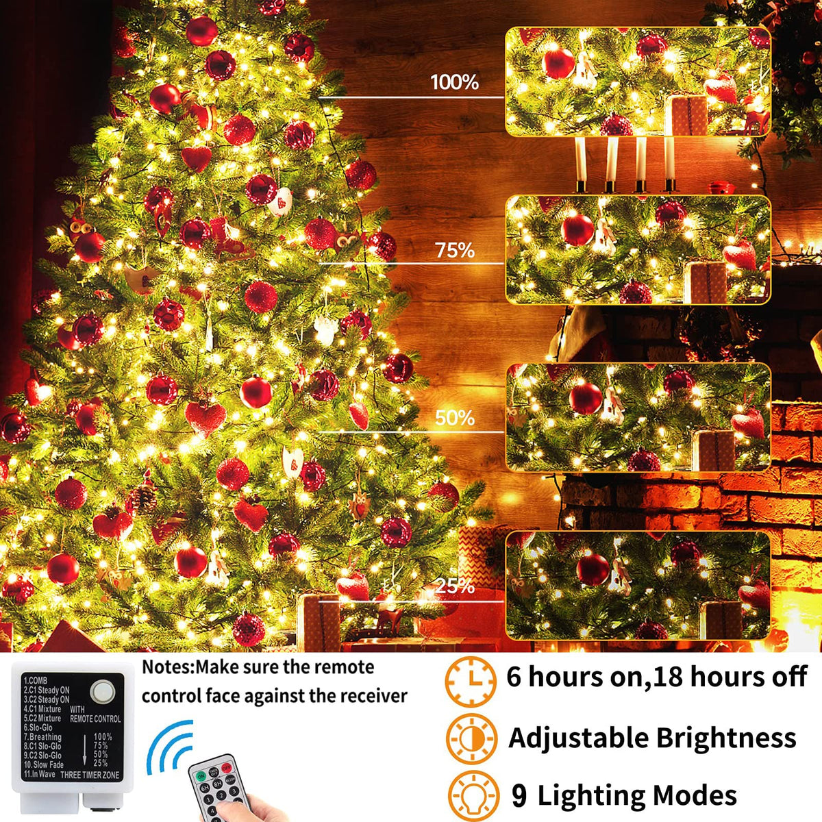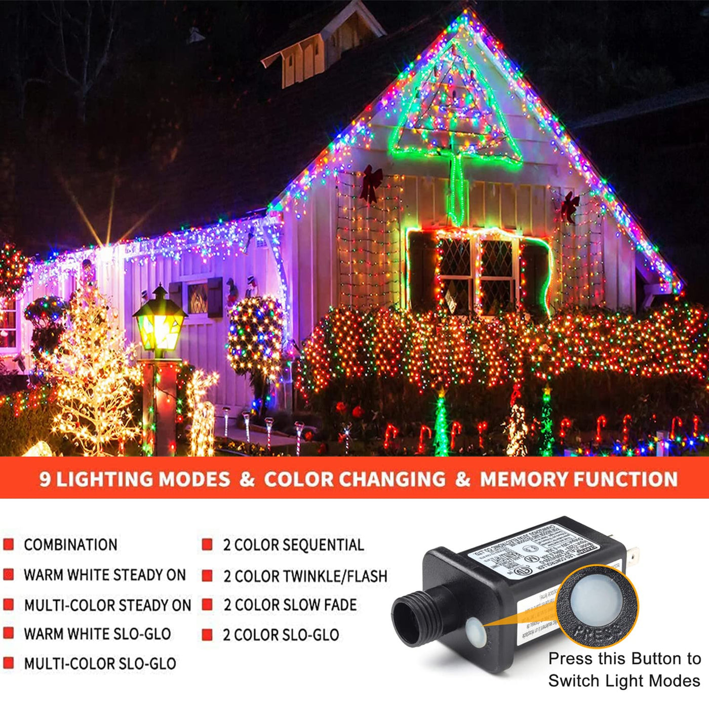 Specifications Light Color: Warm White Application: Indoor/Outdoor Led Quantity: 300 Led String Length: 105Ft / 32M Work Mode: 8 Lighting Modes Input Voltage: 120V Output Voltage: 29V Waterproof Rate: Ip55 Wire Length To First Led: 6.6Ft / 2M Led Spacing: 0.3Ft / 0.1M 4 Sets Connectable Each String Is 99 Feet With 300 Warm White Leds + 6.7 Feet Extra Wire From Plug To The First Led. And 4 Sets Connectable For You To Expandable For Cover Larger Area. 8 Modes + Remember Function This Christmas Lights Include 8 Modes: Combination, In Waves, Sequential, Slogs ,Chasing/Flash, Slow Fade, Twinkle/Flash, And Steady On. And It Can Intelligent Remember Your Last Setting, No Need Reset Every Time. Ip55 Waterproof Rank High Waterproof Rank Make It Can Withstand Heavy Rain And Snow, Perfect For Indoor And Outdoor Decorations.