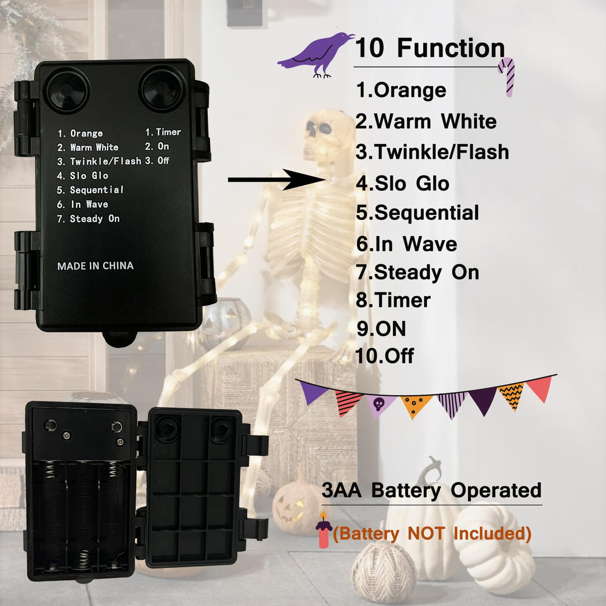 Q: What are the lighting functions available for the Hairui Lighted Black Maple Garland?A: The Hairui Lighted Black Maple Garland features 7 lighting functions including orange, warm white, twinkle, slo glo, sequential, in wave, and bi color steady on, allowing you to customize the ambiance for your Halloween decorations.