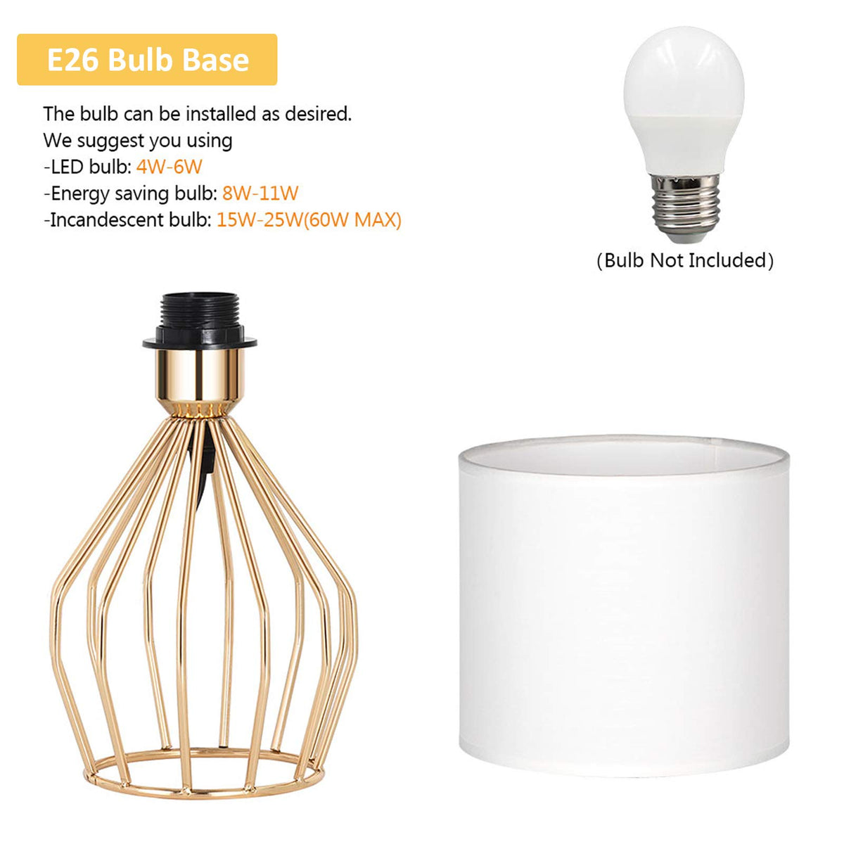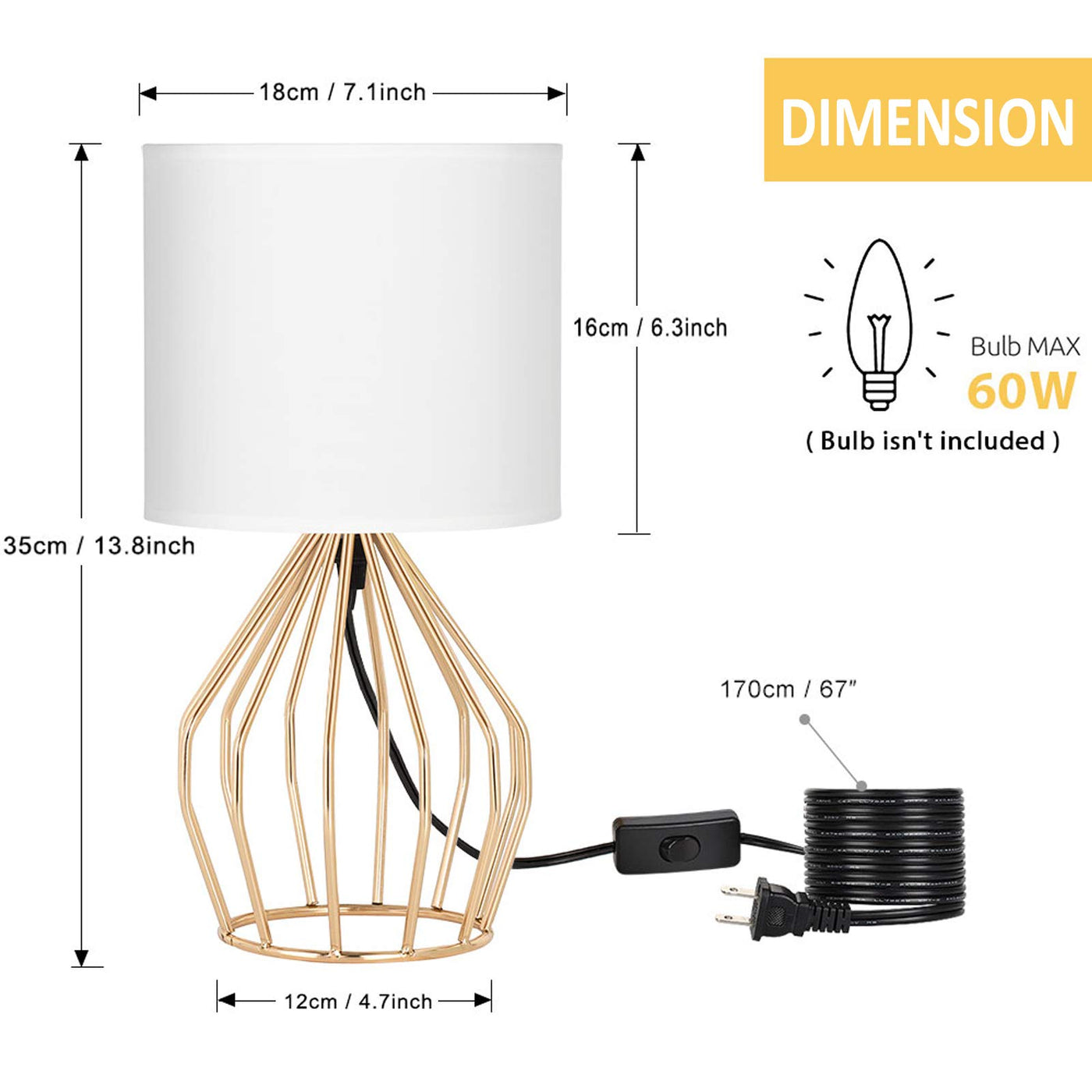 Versatile Table Lamp ?? Its Unique And Beautiful Design Will Elevate The Aesthetics Of Any Room And Display An Elegant And Beautiful Warmth Atmosphere To A Room. It? A Great Desk Lamp Office, Reading Desk Lamp, Kids Room Lamp, Girls Room Lamp, Living Room Lamp, Kitchen Lamp, Essentially Anywhere That Is Needed For Added Brightness. Bulb Requirements ?? Haitral Nightstand Lamp For Bedroom Can Be Only Equipped With E26 Standard Size Light Bulbs (Bulb Not Included), Please Make A Sure The Max Power Of The Bulb Can? Be More Than 60 Watts Before Use. And It? Compatible With A Variety Of Light Bulbs, Such As Incandescent Bulbs, Halogen Bulbs, Edison Bulbs, Led Or Cfl Light Bulb. Such As Edison Bulb Will Create Romantic And Warm Lighting For Your Room, Led Bulbs Are Brighter And More Energy Efficient. (Bulb Isn? Included In The Package) Kindly Tips ? If There Is Any Missing Parts When Receiving Or Any Other Problem Please Kindly Contact Us First, We Will Support You A Best Solution! ? Bulb Is Not Included In The Package, You Need To Buy It At Your Local Shop Or Amazon.Com, The Maximum Power Of The Bulb Is 60 Watts. (Please Be Clear It When You Browse) ? This Small Table Lamp Is Designed As A Small Lamp, Please Pay Attention To The Size Of Lamp Before Buying! (Please Be Clear About The Size When You Browse) Specification: - Shade Color: White - Frame Color: Gold - Shade Material: Fiber Flax / Fabric - Frame Material: Metal - Bulb Wattage: Max 60W - Overall Size: 13.8 * 7.1 * 4.7 Inches - Power Supply: Ac Powered - Power-Up State: Ul Plug - Switch Type: Button Switch - Bulb Base: E26(Bulb Isn? Included In The Package) - The Length Of Power Cord: About 67 Inches (Switch Is On Cord And Distance From The Base Is 7.9 Inches) Package Included: -- 1 X Table Lamp (Without Bulbs)