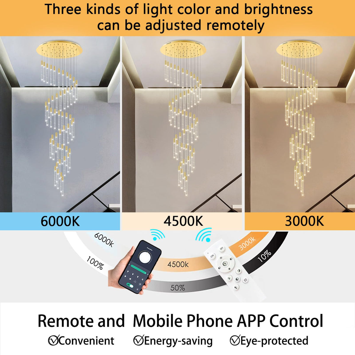 HAIXIANG 20 Foot 48-Light Gold High LED Dimmable Chandeliers Ceiling Pendant Light Fixtures Remote Control Light Fixtures Crysta
