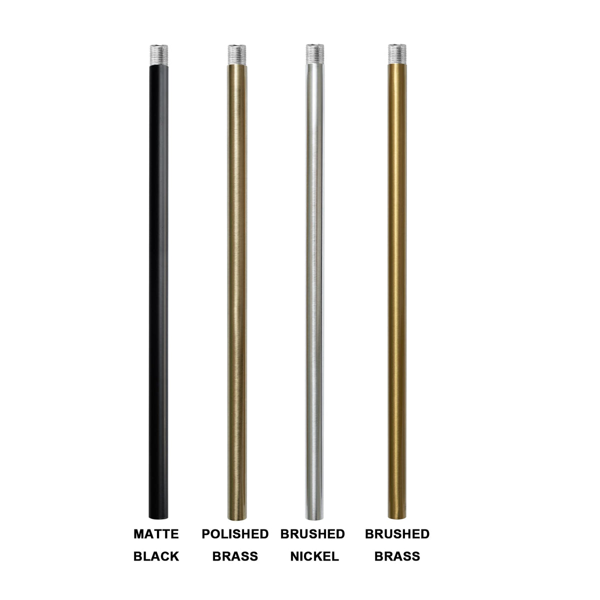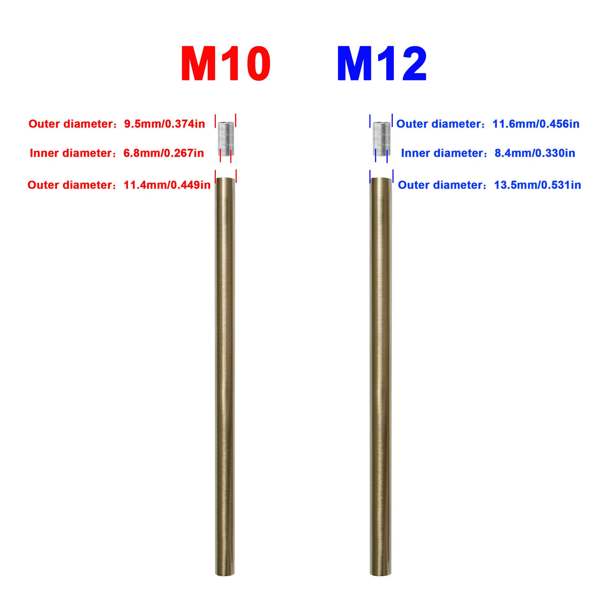Q: What is the length and diameter of the Haligate Polished Brass M10 Threaded Extension Rod?A: The Haligate Polished Brass M10 Threaded Extension Rod has a length of 12 inches, with an outer diameter of 0.449 inches and an inner diameter of 0.267 inches, allowing wires to pass through.