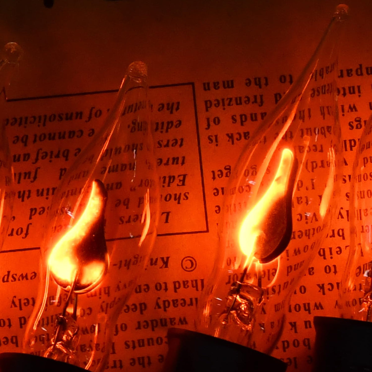 < p >12 Pack Clear flickering flame light bulbs< br >< br > ? Specifications:< br > Bulb Type: C18< br > Voltage: 120v< br > Wattage: 1W< br > Base Type: C7/E12 Screw Base< br >< /P > Light Type: Incandescent Lights Light Time: 2000+ Hours < p > ? ?Unique Flame Effect?: Add warm touch to your fall decorations, create a spooky touch to your indoor outdoor Halloween decorations or decorate your Christmas table with our realistic flame flicker light bulbs.< br >< /P > < p > ? ?Endless Halloween decorations possibilities?: Halloween E12 base flame incandescent bulbs with realistic fake flame not only can creating a spooky atmosphere on Halloween decor indoor outdoor, but also can build a warm and cozy ambiance for fall decor and Christmas decor, versatile use as C7 replacement bulbs, Halloween decorations of fireplace, fence lights, Halloween party decor home decor haunted decor lights spare bubls, Halloween terror decorations electronic candle light bulbs, Christmas romantic dinner candlestick light bulbs and more< br >< /P > < p >?Durability Upgrade Technology?Our UL listed flame light bulbs outdoor through innovative technology, the durability of the C7 bulbs has been greatly improved, with an illumination time of up to 2000+ hours, which mean our flame bulbs for outdoor lights can be lit continuously during Halloween and beyond.< br >< /P >