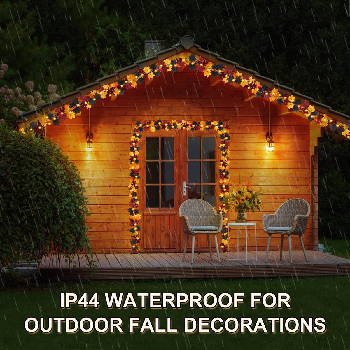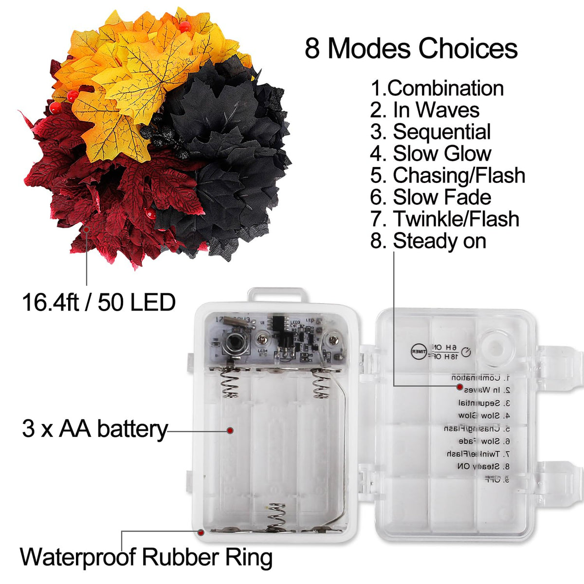 The autumn fall garland lights with timer, no wiring required, and not a battery eater, press the remote and set timer function to save your time.