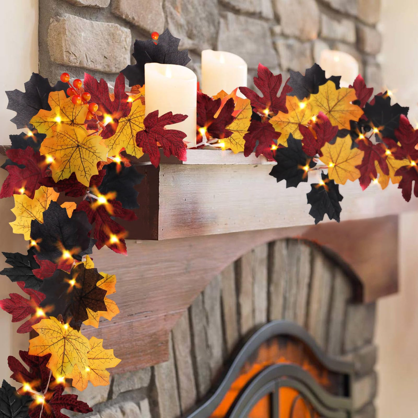 The orange and yellow leaves lit by the vibrant orange lights make for a great blend of colors to warm up any places. Perfect festival decorations with no outlet needed, and easy to decorates tabletop, mantle, fireplace, doorframe, doorway, stair banisters, etc.